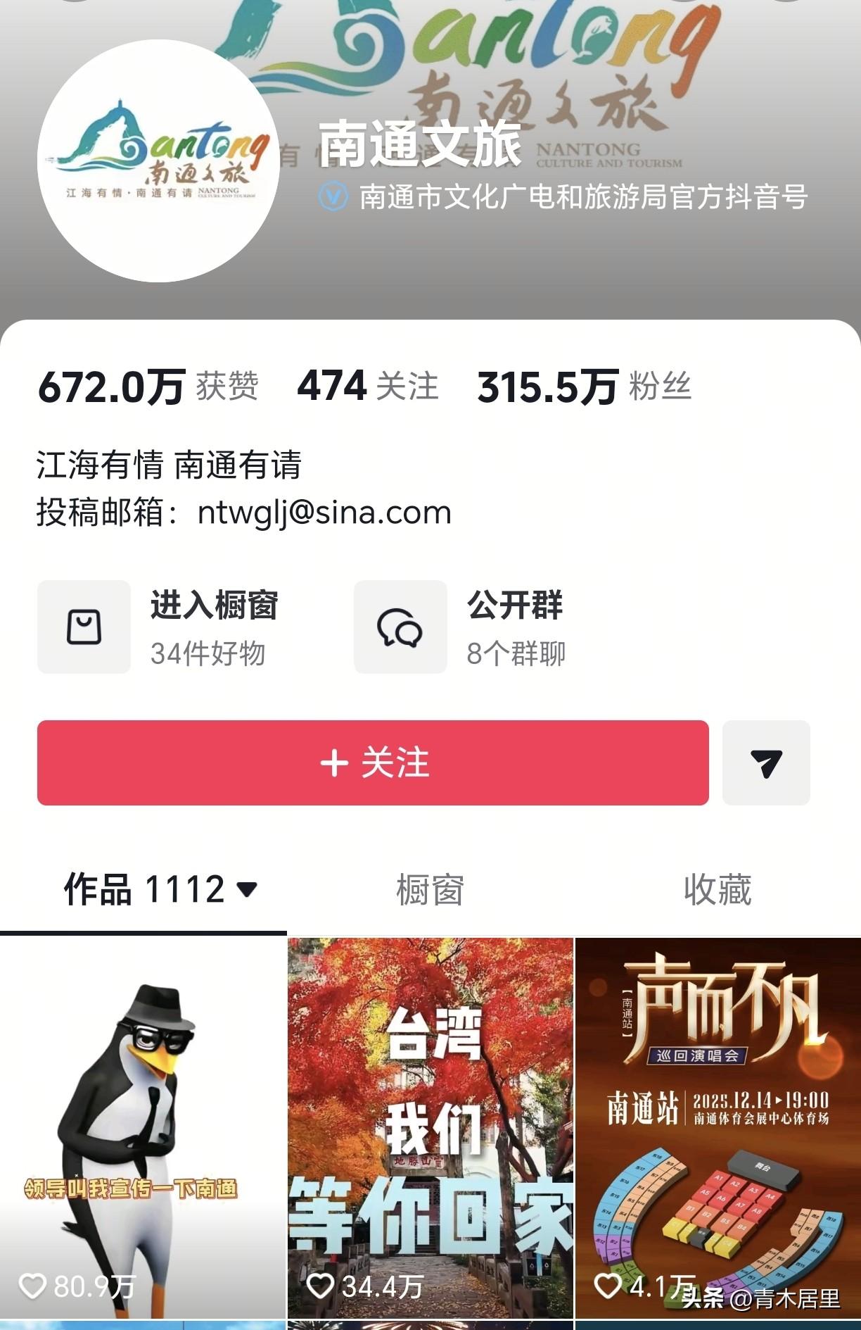 昨天粉丝34万,今天截止到现在已经315万了,粉丝还在持续上涨,照这势头,感觉要破千万。 南通文旅还是牛啊。现在的自媒体,有很多事情不敢随便评论,随便说的。南通文旅的那六个大字,可谓是直接封神了,道出了很多人的心中想说的话。
