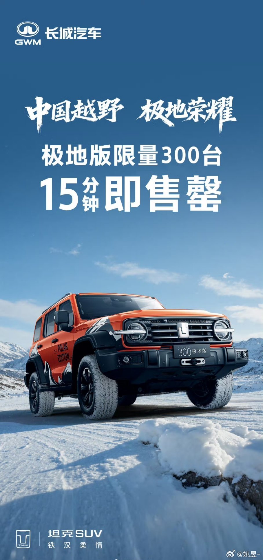 车展上我就对坦克300极地版挺感兴趣结果坦克的小伙伴告诉我限量300台,已经售罄了2.4T柴油与2.0T汽油双动力,AT越野胎、遥控绞盘等直接原厂给到你,“极地橙”车漆搭配雪山元素细节,展现了与科考工程师一同征战南极的决心新登场的坦克400敦煌紫、坦克500敦煌绿,直接成为都市潮人打卡点,机甲外观+敦煌文化,上市仅两周销量就冲破5000台,真是出场即爆款