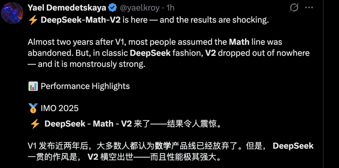 DeepSeek开源了IMO金牌级数学模型:DeepSeek-Math-V2,这个模型基于 DeepSeek-V3.2-Exp-Base 开发,它的性能优于 Gemini DeepThink,实现了 IMO 金牌级的水平。这个版本最大的亮点,它不只是生成答案,而是引入了一个专门的“验证器”模型来检查推理步骤,模仿了人类数学家“大胆假设,小心求证”的过程,其中:生成器:负责提出解题思路和步骤。验证器:负责评估每一步的逻辑严密性,甚至能主动发现并纠正错误。冷启动与强化学习:基于DeepSeek-V3.2-Exp-Base底座,利用强化学习针对数学领域进行了深度优化。这种自验证机制为什么重要? 是因为它直接解决了数学 AI 长期存在的核心问题:算对答案,并不意味着真正懂得推理。DeepSeek新模型有多猛