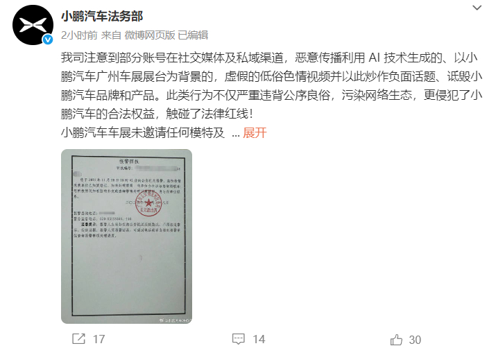 小鹏汽车已取证报警11月28日,小鹏汽车法务部发文,针对近期部分账号在社交媒体及私域渠道,恶意传播利用 AI 技术生成的、以小鹏汽车广州车展展台为背景的,虚假的低俗色情视频并以此炒作负面话题、诋毁小鹏汽车品牌和产品的内容进行辟谣。小鹏汽车表示,我司注意到部分账号在社交媒体及私域渠道,恶意传播利用 AI 技术生成的、以小鹏汽车广州车展展台为背景的,虚假的低俗色情视频并以此炒作负面话题、诋毁小鹏汽车品牌和产品。此类行为不仅严重违背公序良俗,污染网络生态,更侵犯了小鹏汽车的合法权益,触碰了法律红线!小鹏汽车车展未邀请任何模特及演艺人员,也一贯坚决抵制、反对以不良内容展开宣传的行径。我们对这种滥用 AI 技术、恶意抹黑公司形象的违法行为表示强烈谴责并会坚决追责到底!目前,公司已全面固定相关证据并正式报警,公安机关已介入调查。我们坚信违法之人必将付出代价!小鹏辟谣车展邀请模特及演艺人员