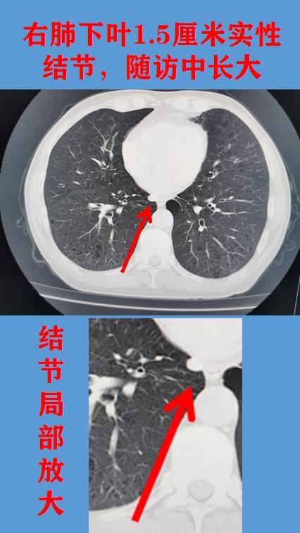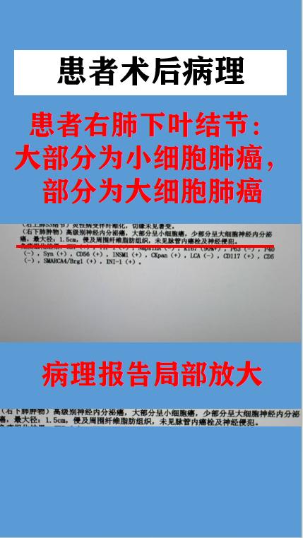 胸部CT提示淋巴结,手术病检小细胞肺癌。周二出肺癌肺结节门诊,来了一位男性患者,59岁,机关工作人员。自述发现右侧胸腔结节3个月,近日复查长大,原来1.3厘米,现在1.5厘米。