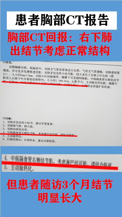 我看了它的胸部CT图片,该患者有2个肺实性结节,一个位于右肺上叶前段,一个结节位于右下肺,靠近食管。右下肺结节胸部CT报告提示:食管旁淋巴结可能。