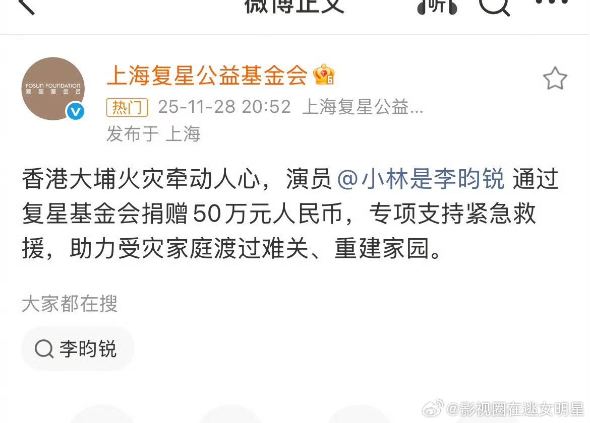李昀锐捐款50万李昀锐为香港捐款50万李昀锐通过复星基金会捐赠50万元人民币,专项支持紧急救援,助力受灾家庭渡过难关、重建家园
