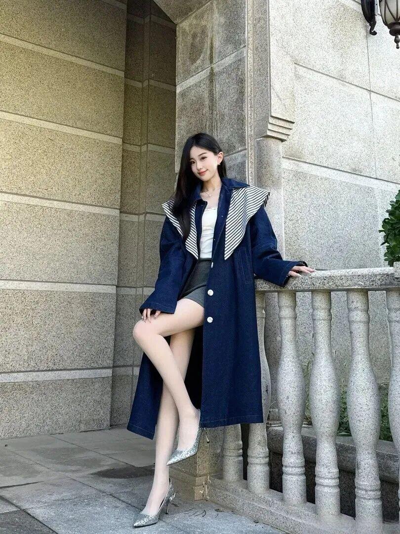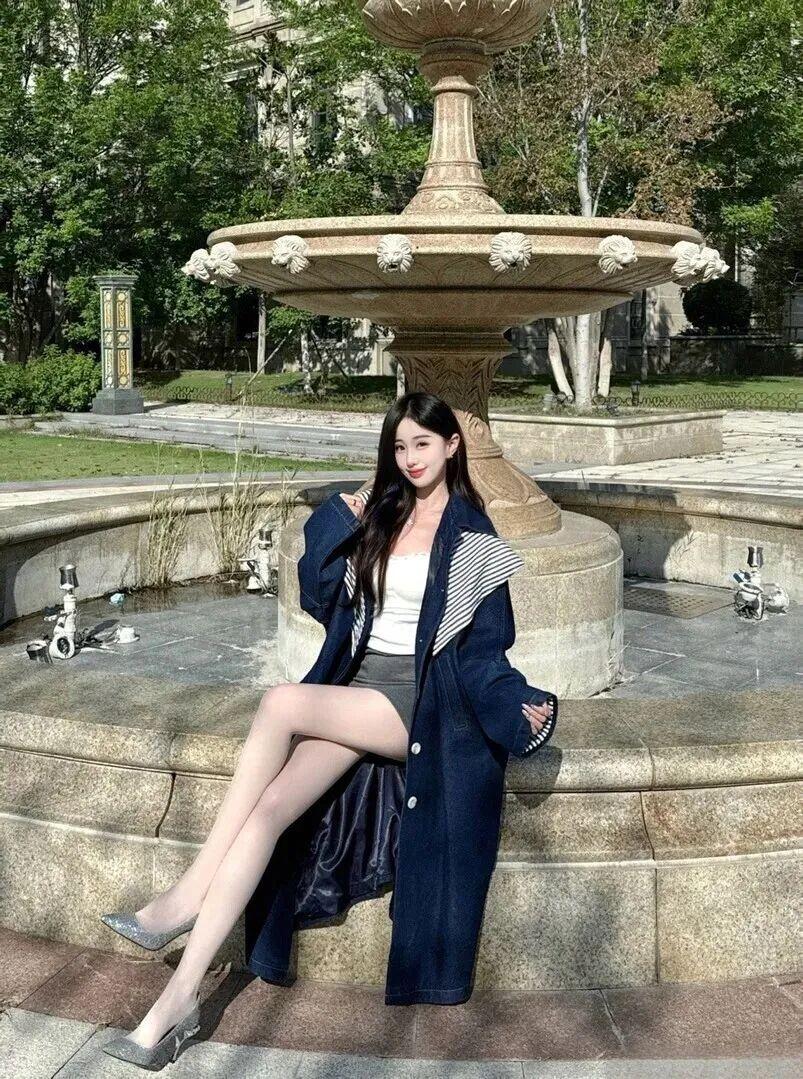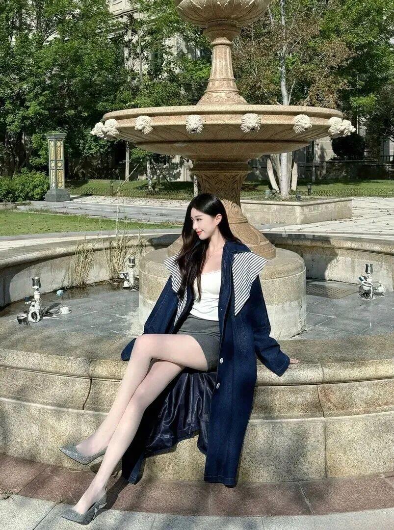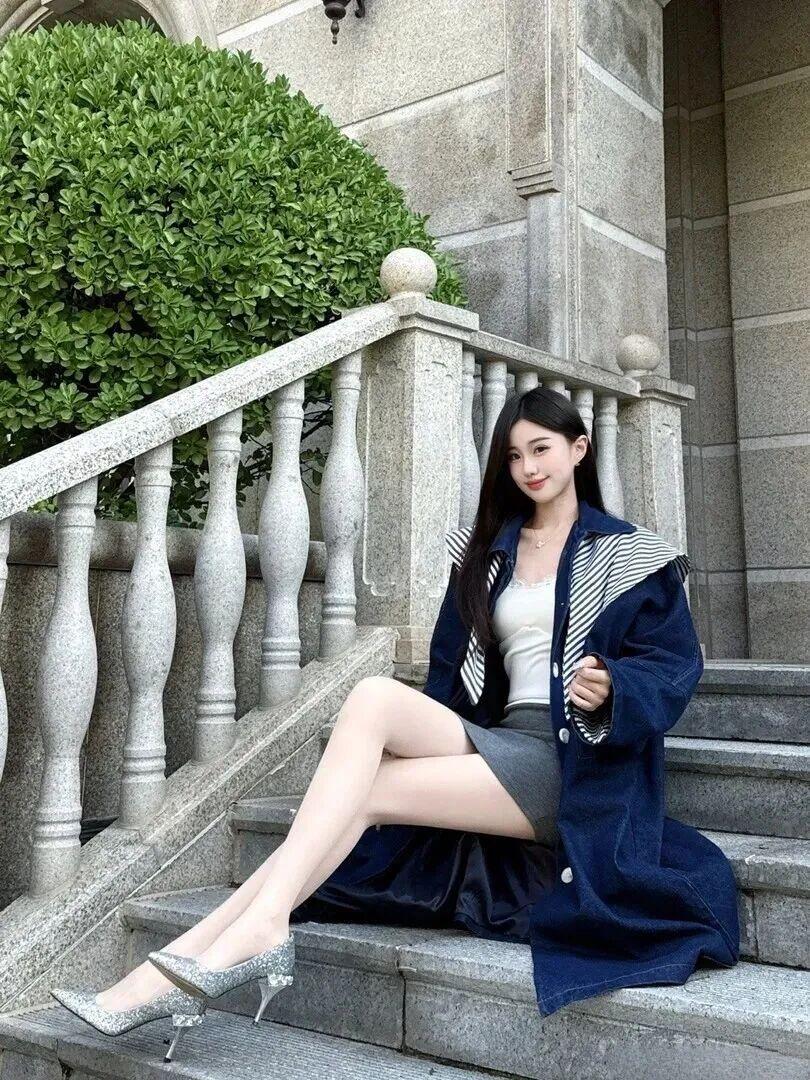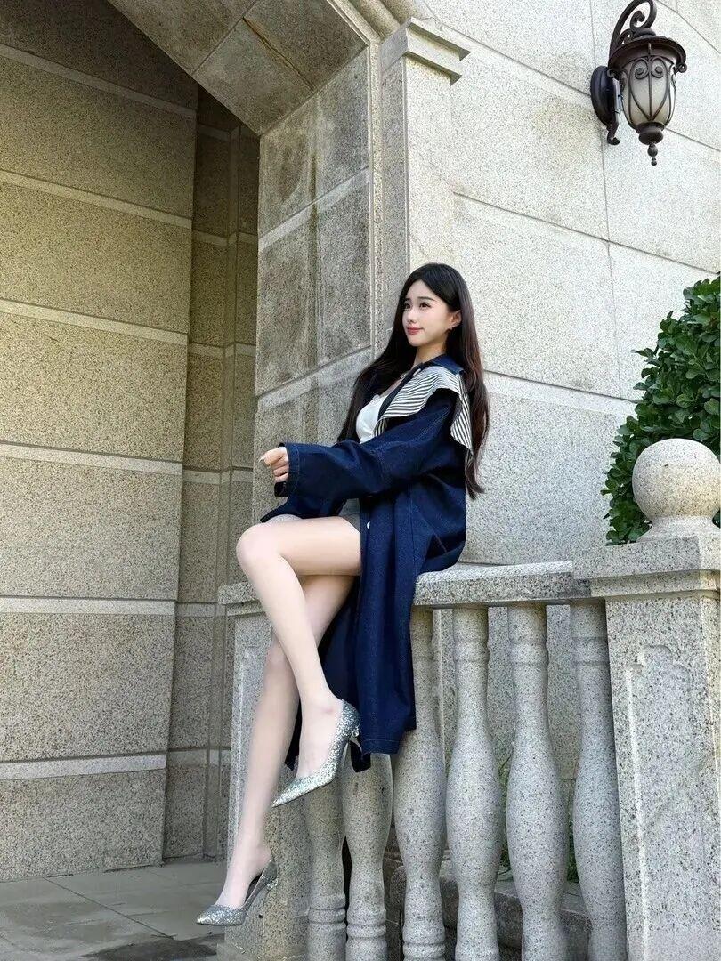 石料沁出的凉意透过薄呢外套渗入肌肤时,她忽然想起三年前在卢浮宫摸到的断臂维纳斯基座。同样的希腊多立克柱式在身后投下几何阴影,赭色砂岩被百年风雨蚀刻出深浅沟壑,像老人手背隆起的血管。银灰色高跟鞋尖正对柱础凹槽,鞋跟与石缝间卡着片枯槁的银杏叶,边缘蜷曲如烧焦的羊皮纸。 深蓝大衣下摆垂落成优雅的弧,露出内搭白衫的黑金条纹——那是昨夜从拍卖行画册上撕下的康定斯基抽象画局部。风掠过柱廊时,衣料褶皱里藏着的雪松尾调悄然逸散,与石缝青苔的土腥气在晨光中缠绕成莫比乌斯环。她搭在栏杆上的左手无名指戴着素圈银戒,戒面细看錾刻着鸢尾花纹,与柱头茛苕叶浮雕形成跨越时空的对话。 七点十二分的阳光以四十七度角切开柱列,在她小腿镀上琥珀色光带。黑色皮质短裤边缘恰停在光线分界处,如同精心计算的黄金分割。对面拱窗倒影里,她看见自己的轮廓与石柱阴影重叠,恍若某幅超现实主义画作中被解构的都市寓言。远处墨绿龟背竹叶片上,露珠正沿着叶脉滚落,轨迹与她高跟鞋跟的抛物线惊人相似。 当教堂钟声穿透柱廊,惊起石缝里的灰鸽,她终于从大理石扶手上抬起右手。指尖残留的凉意渗入肌肤,化作腕间积家翻转腕表表盘上跳动的蓝钢指针。这个瞬间,巴洛克建筑凝固的乐章与现代成衣流动的线条,在晨光中达成了微妙的和解。