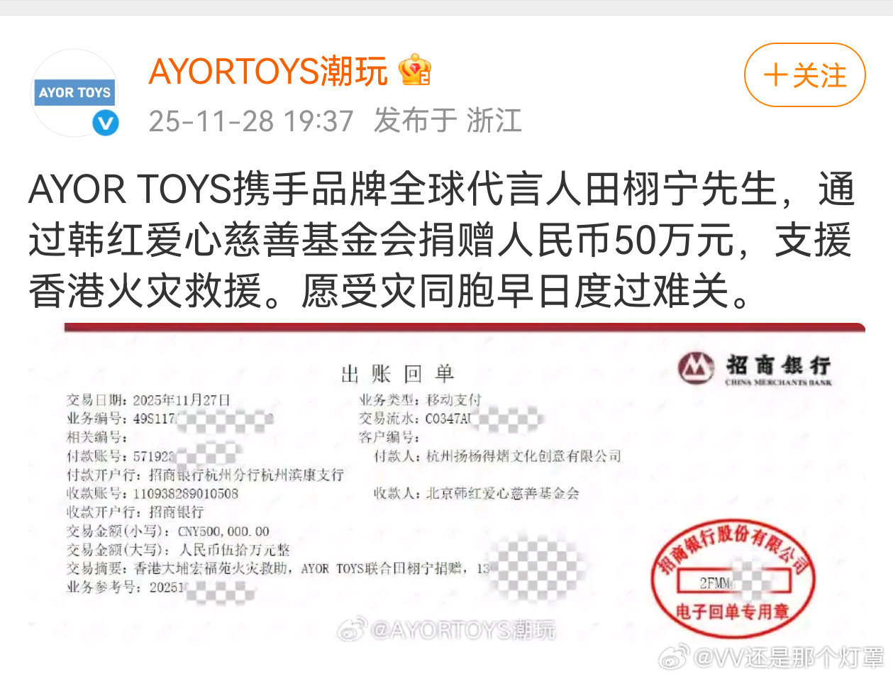 田栩宁捐赠30万本人捐30w 粉丝捐40w 杂志捐50w 代言潮玩捐50w善意的正向循环。另外这杂志敢这么大一笔捐证明田栩宁的销量真的没水。