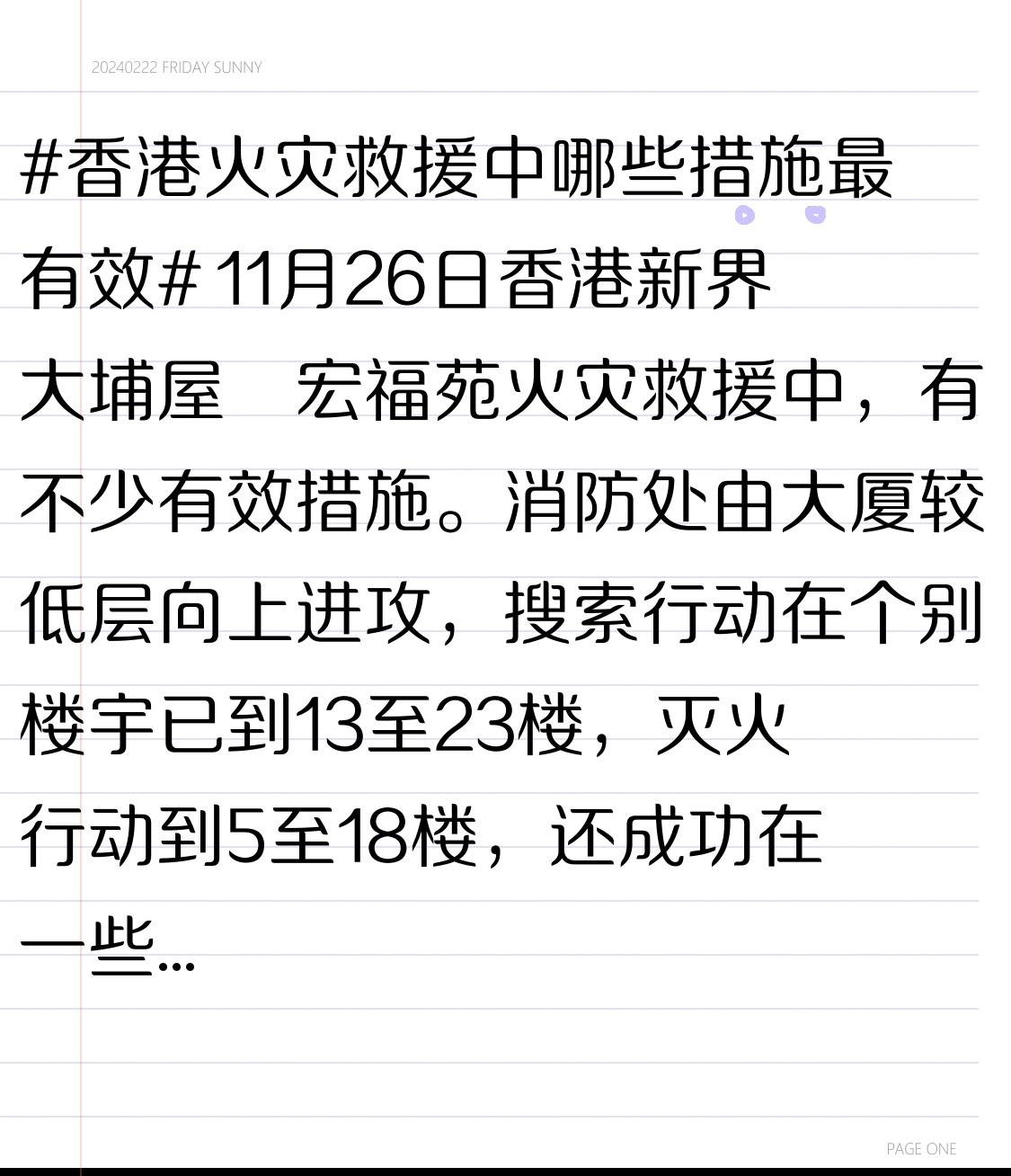 11月26日香港新界大埔屋邨宏福苑火灾救援中,有不少有效措施。消防处由大厦较低层向上进攻,搜索行动在个别楼宇已到13至23楼,灭火行动到5至18楼,还成功在一些楼宇找到生还者,这种逐层推进搜索救援的方式很关键。 对于居民来说,掌握逃生技巧也极为重要。像“小火快跑,大火关门”,小火且逃生路线未被挡就快跑;火大但自身未受威胁、楼道无可燃物时关门等待救援。深圳彭先生一家遇火灾,用湿毛巾堵门缝、捂口鼻,开窗通风求救,安抚孩子等操作,也为高楼火灾自救提供了范例。