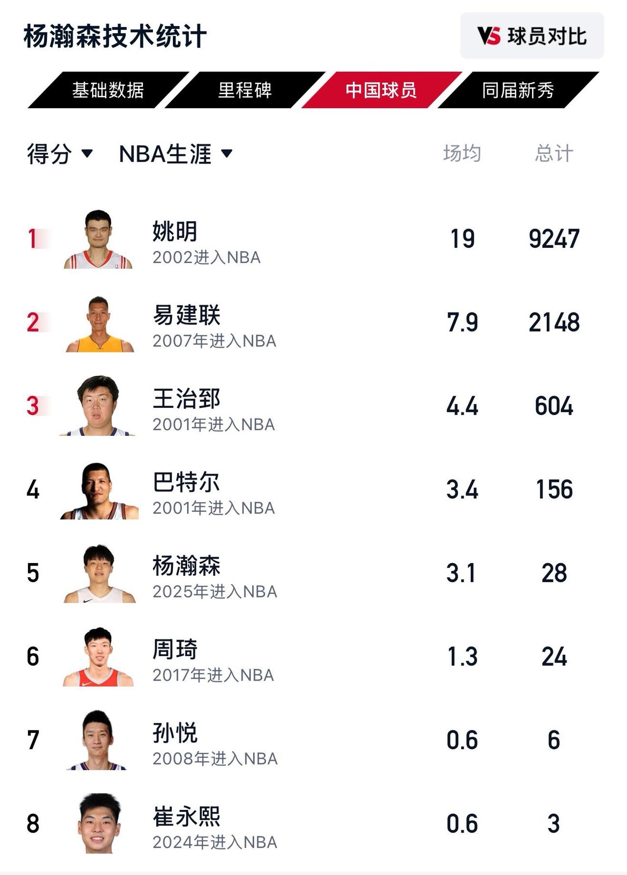 杨瀚森目前NBA总得分28分,排在国内球员在nba得分榜第5位,距离第4的巴特尔还差128分,距离第3的王治郅还差576分,杨瀚森未来得分能排第几? 杨瀚森进nba也已经有一段时间了,目前打了10场比赛,拿到了28分,其中表现最好的一场是对阵太阳,拿到了9分5篮板3助攻1盖帽的数据。 不过目前开拓者给杨瀚森的上场时间并不多,最近2场只给上一两分钟时间,最近2场比赛一分未得。 如果给杨瀚森场均10分钟的上场时间,得分超过巴特尔是没有问题的,再打一两个赛季,超越王治郅也不是没有可能,不过想超过易建联,目前来看,显然是没有机会的。