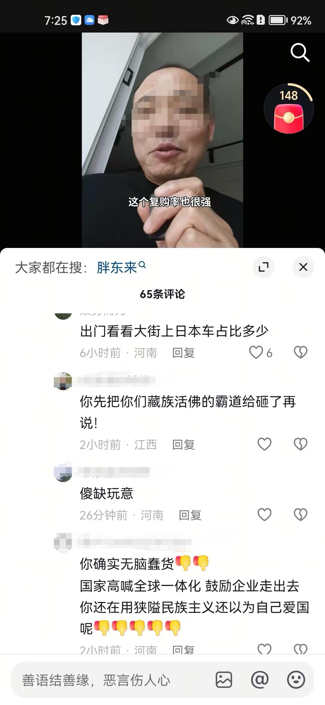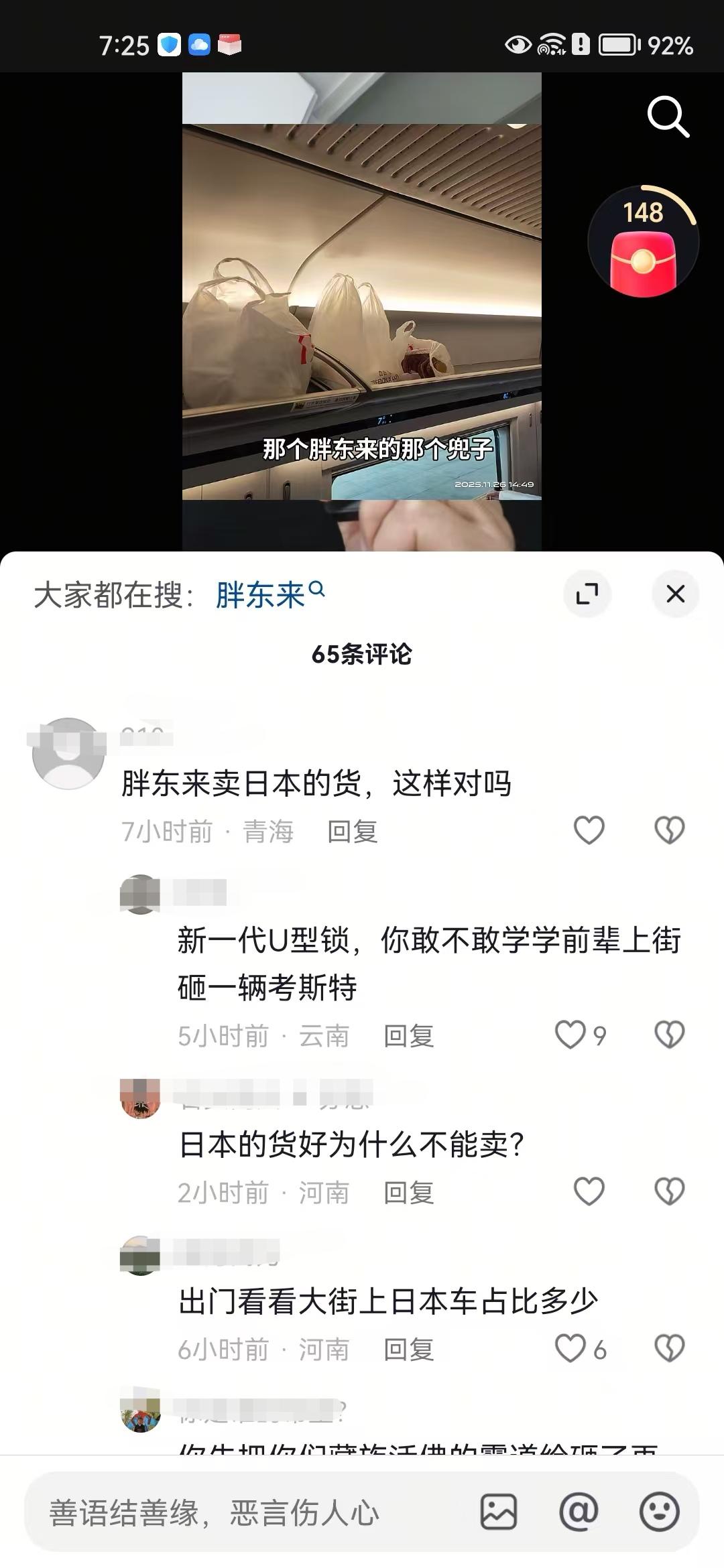 胖粉有多疯狂,网友评价了一句胖东来卖日货,结果被七八个胖粉给轮流怼了,现在的胖粉真的太疯狂了。 现在的胖粉在关于胖东来的视频底下搞一言堂,只允许说胖东来好,不允许任何质疑胖东来的声音。 有位网友评价了一句胖东来卖日货,结果引来了七八个胖粉围殴,说什么U型锁,日货好凭什么不能卖,怎么不去把路边的日车砸了之类的。 网友也只是质疑了一句,因为之前的历史,加上最近关系紧张,这么评论也是正常的,事实上胖东来日货确实很多,尤其是化妆品、洗发水、卫生巾、零食这些,应该是国产超市里面日货最多的一家超市。 胖东来卖日货这没什么问题,毕竟确实有需求,不过胖粉有点太疯狂了,容不得有关胖东来相关的评论有任何一句不好的评论,否则就会遭到他们的围殴。