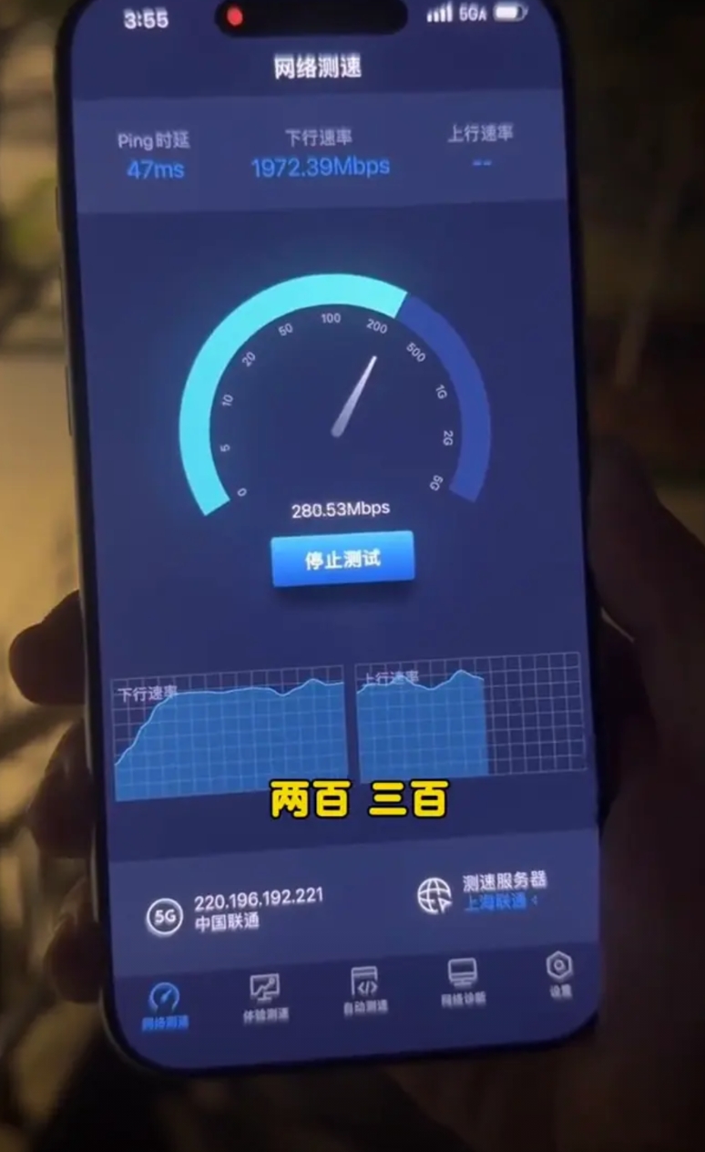 华为Mate 80 Pro Max和iPhone相比谁的网速更快? 先看华为,开始。大家着重看上传速度,已经到一个G了,1038、1042、1042,大概稳定在1046、1045左右。现在在看iPhone,准备好了吗?开始,iPhone这个上行不行了?两百、三百、五百都还不到,最后302。 果然华为的5A速度先人一步,不只是Mate 80,MateX7也是同样的速度。