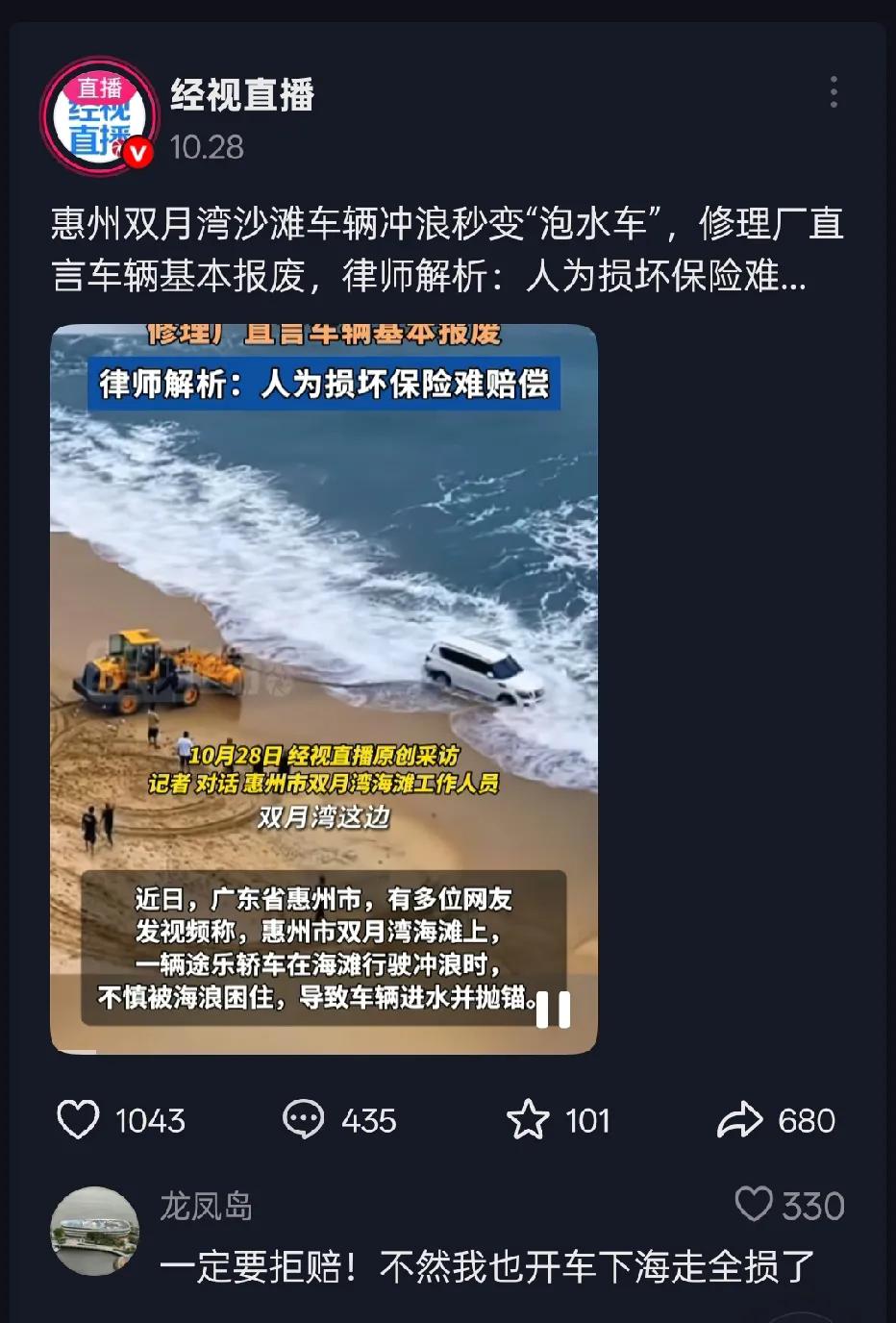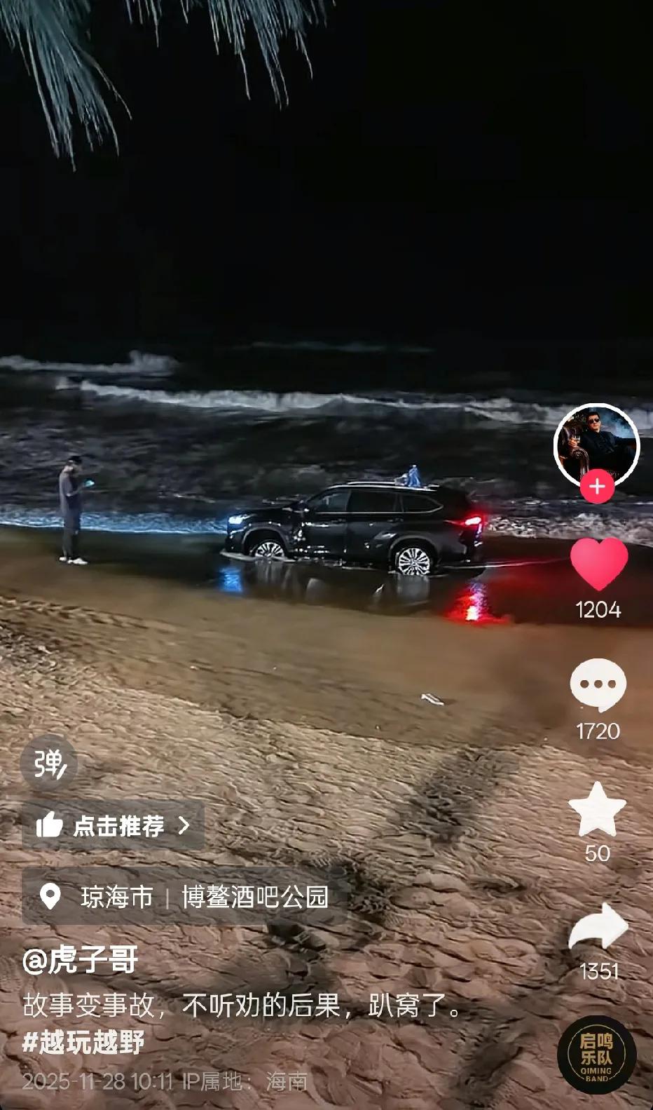 车主是怎么想的?是没看过这类事情吗?前段时间,也就是上个月,才刷到过惠州的双月湾海滩(图3),也是一位车主开车到沙滩那里耍酷,结果车子被海水泡了。。最后被拖车运走了。 如今,在博鳌这边,也刷到了这种事。一定要敬畏大海啊,别以为在沙滩上,就可以随便开车过去耍,这下好了,被海水泡了,这是想换车了啊……后续的话,车子还能不能继续使用?保险会不会给泡海水的这位车主赔呢?大家说说。