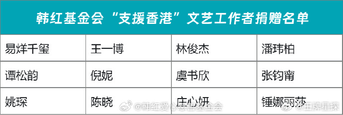 韩红基金会支援香港捐赠名单韩红基金会支援香港捐赠名单:易烊千玺,王一博 ,林俊杰,潘玮柏,谭松韵,倪妮,虞书欣,张钧甯,姚琛,陈晓,庄心妍,锤娜丽莎,12位艺人爱心捐赠735万元,大爱无疆,祈愿平安