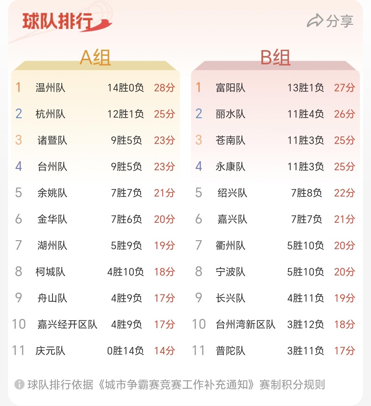 如果温州队VS富阳队,不知道谁会更胜一筹!浙BA小组赛,11月28日晚继续精彩进行。富阳队77VS75丽水队,两队均打出了非常好的状态。最终丽水队在紧追比分的过程中,以两分惜败。 今晚的另一场比赛是,永康队89VS85长兴队,最终永康队领先4分,取得本场比赛的胜利。 本场比赛过后,富阳队以13胜1负的成绩,进一步巩固了在B组第一的优势。紧随其后的是丽水队、苍南队和永康队。