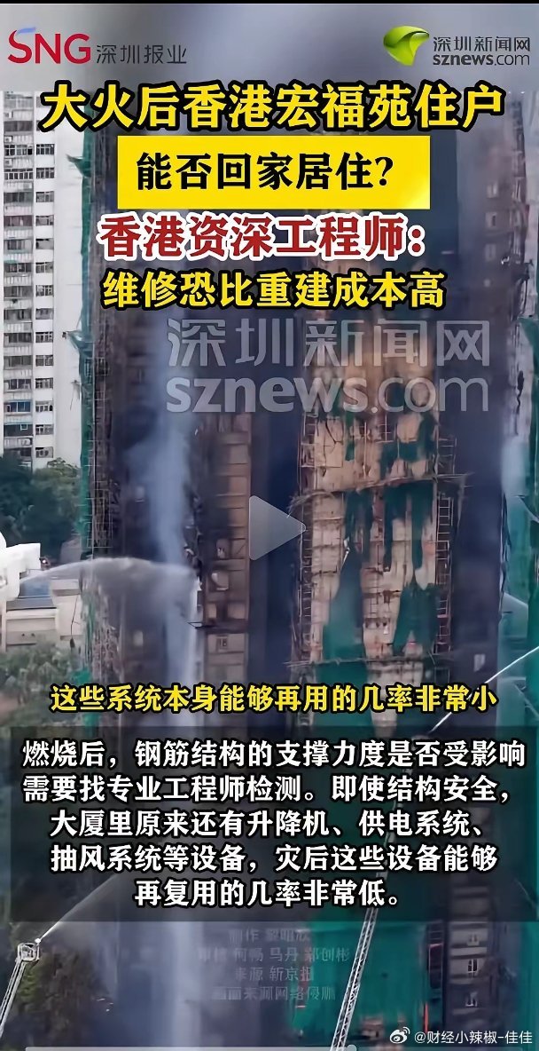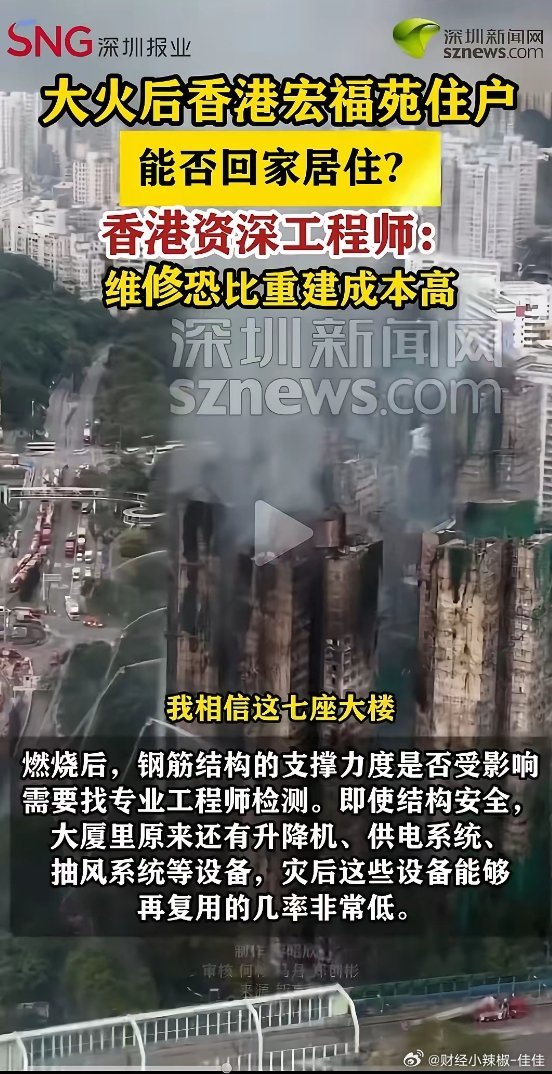 香港宏福苑估计很快会重建了。刚刚看到香港资深工程师说了香港宏福苑的维修成本比重建成本高。灾后的供电系统,抽风系统能够重新使用的概率很低。很多居民都在问能否回家住,这位资深工程师的话几乎已经给出了答案。毕竟是42年的老楼,修缮的费用高昂,还不如原地重建,香港政府已经出资3亿,内地60家企业捐款已经超过5亿,香港的富豪家族捐款也超过过2亿,再加上其他捐赠,建七幢楼估计在15亿左右,这个资金还是足够的。只是再建的话希望不再建那么高,一幢楼17层左右为最佳,符合香港消防云梯55米的基本救援要求。