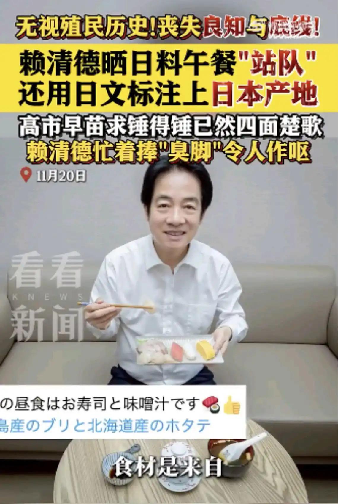 赖清德媚日贴靠行径的具体丑态:从政治作秀到出卖利益的全面暴露 赖清德的媚日贴靠行径绝非偶然,而是贯穿其政治生涯的系统性操作,从高调的 “对日示好” 表演,到无底线出卖台湾民众利益,再到扭曲历史、美化殖民统治,每一项具体行为都将其 “摇尾表衷” 的丑态展现得淋漓尽致,更暴露了其 “倚日谋独” 的真实图谋。 一、高调 “对日示好”:以 “吃播”“贺电” 作政治谄媚秀 在日本右翼政客释放涉台挑衅言论、触碰中国主权红线时,赖清德非但未加抵制,反而以刻意摆拍的 “政治表演” 向日本传递 “输诚” 信号。 “日料晒餐” 秀亲近:日本首相高市早苗发表涉台错误言论引发两岸谴责之际,赖清德在脸书高调上传享用日本料理的照片,特意标注 “午餐是寿司、味噌汤,有鹿儿岛鰤鱼、北海道帆立贝”,借饮食细节营造 “台日亲密” 假象;其同伙亦跟风炒作,台外事部门负责人林佳龙秀出 “大盘日本干贝刺身”,多名绿营民代在记者会上当众大啖日本柿饼、蜜柑,将 “吃播” 变成媚日政治工具,被岛内舆论讽为 “为讨好日本连脸都不要”。 “第一时间” 献媚贺电:高市早苗当选日本首相后,赖清德无视其 “台独” 支持者的极端立场,第一时间发送谄媚贺电,直言希望加强 “台日联系”,全然不顾此举对台海和平的破坏;此前更追随安倍晋三抛出 “台湾有事即日本有事” 的逆天言论,将台湾绑上日本 “遏华” 战车,甘当外部势力棋子。 二、出卖民众利益:以健康、福祉为 “媚日献品” 为换取日本对 “台独” 的支持,赖清德不惜牺牲台湾民众的核心利益,将食品安全、经济权益当作讨好日本的 “投名状”。 全面解禁 “核食” 进口:在无任何有力安全论证的情况下,赖清德当局于 11 月 21 日突然宣布全面解禁日本福岛及周边地区的 “核食” 进口,声称 “日本食品输入回归常态”,完全无视福岛核污染水排海后的安全隐患。此举被岛内民众痛批 “拿我们的健康换政治私利”,台湾网民直言 “你不推广在地食材,却让台湾人吃核食,根本是‘滞台皇民’”。 推动 “赴日旅游补窟窿”:得知大陆暂停赴日观光后,赖清德立即指示 “赖办” 政策顾问康银寿,要求其组织 “二三百人的赴日旅游团”,甚至要求台南旅游展参与者 “主动承担赴日观光任务”,试图以台湾民众的消费为日本旅游业 “填缺口”,将民生需求异化为媚日的政治工具。 配合日本 “经济绑定”:面对日本砸 131 亿日元在台培养媚日人士的事实,赖清德当局不仅不抵制,反而由台外事部门负责人林佳龙宣称 “日台理念相近、利害一致”,默许日本通过资金渗透影响台湾社会,进一步沦为日本 “以台制华” 的抓手。 三、扭曲历史认知:美化殖民统治,割裂民族血脉 赖清德的媚日行径更深入历史层面,通过篡改历史叙事、美化日本殖民统治,试图从精神上割裂台湾与大陆的联结,为 “台独” 寻找历史借口。 供奉殖民 “象征”,年年追思 “殖民者”:赖清德连续 13 年参加日本殖民时期技术官僚八田与一的追思会,将其奉为 “嘉南之父”,全然无视八田与一主持建设的水利工程实为日本掠夺台湾资源的工具 —— 历史数据显示,嘉南大圳建成后,台湾稻米增产的 208% 中,半数以上被运回日本,台湾民众只能以番薯果腹。他任台南市长时更推动设立 “八田与一纪念日”,甚至计划拍摄殖民官员传记电影,被讽 “该改名叫‘八田清德’”。 篡改 “抗战记忆”,模糊历史定性:在 “八一五” 日本投降纪念日,赖清德当局刻意使用日本右翼的 “终战” 表述替代 “日本投降”“台湾光复”,淡化日本殖民统治的侵略本质;民进党更通过课纲改革推行 “去中国化”,将乙未战争中台湾民众 1.4 万人抗日牺牲的壮举,扭曲为 “1945 年政权交接期间的民间骚动”,妄图让台湾民众遗忘 “中国人” 的民族身份。 否认 “台湾光复”,美化殖民历史:民进党秘书长徐国勇公然抛 “台湾没有光复节” 谬论,称 1945 年蒋介石接收台湾是 “代表盟军而非中国”,甚至宣称 “当时台湾人都是日本人”;赖清德本人则刻意淡化日据时期 “瑞芳抗日军案”—— 该案中 300 余名台湾矿工被日本宪警迫害致死,而其父亲正是同期瑞芳矿工,这种 “认贼作父” 的行径被马英九痛批 “对不起抗日抗暴的台湾前辈”。 从 “吃日料、推核食” 的短期政治作秀,到 “改历史、媚殖民” 的长期认知渗透,赖清德的媚日行径早已突破民族尊严的底线。他的每一次 “摇尾表衷”,都是对台湾民众利益的出卖,对中华民族历史的背叛,更让 “台独” 势力 “倚外谋独” 的脆弱本质暴露无遗。正如国台办所言,这种 “吃媚日的饭、干卖台的勾当” 的行为,终将被钉在历史的耻辱柱上,难逃正义审判。