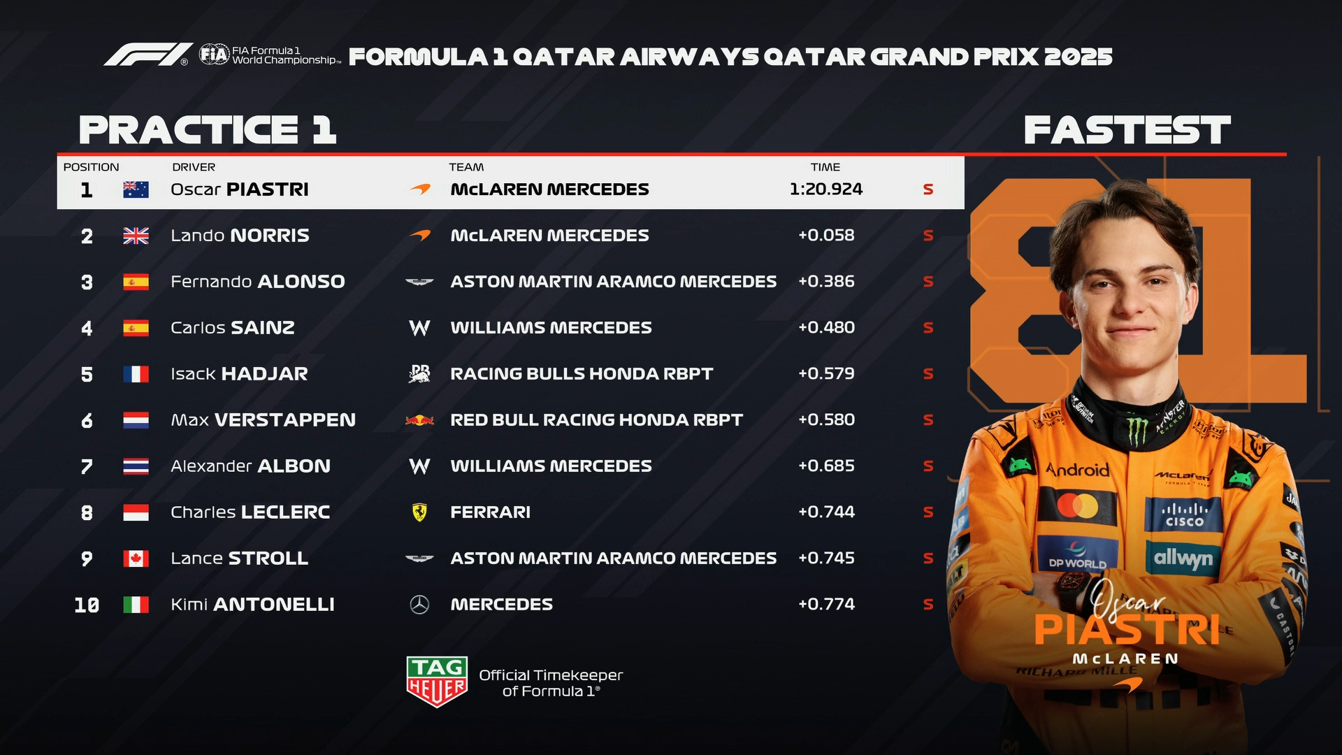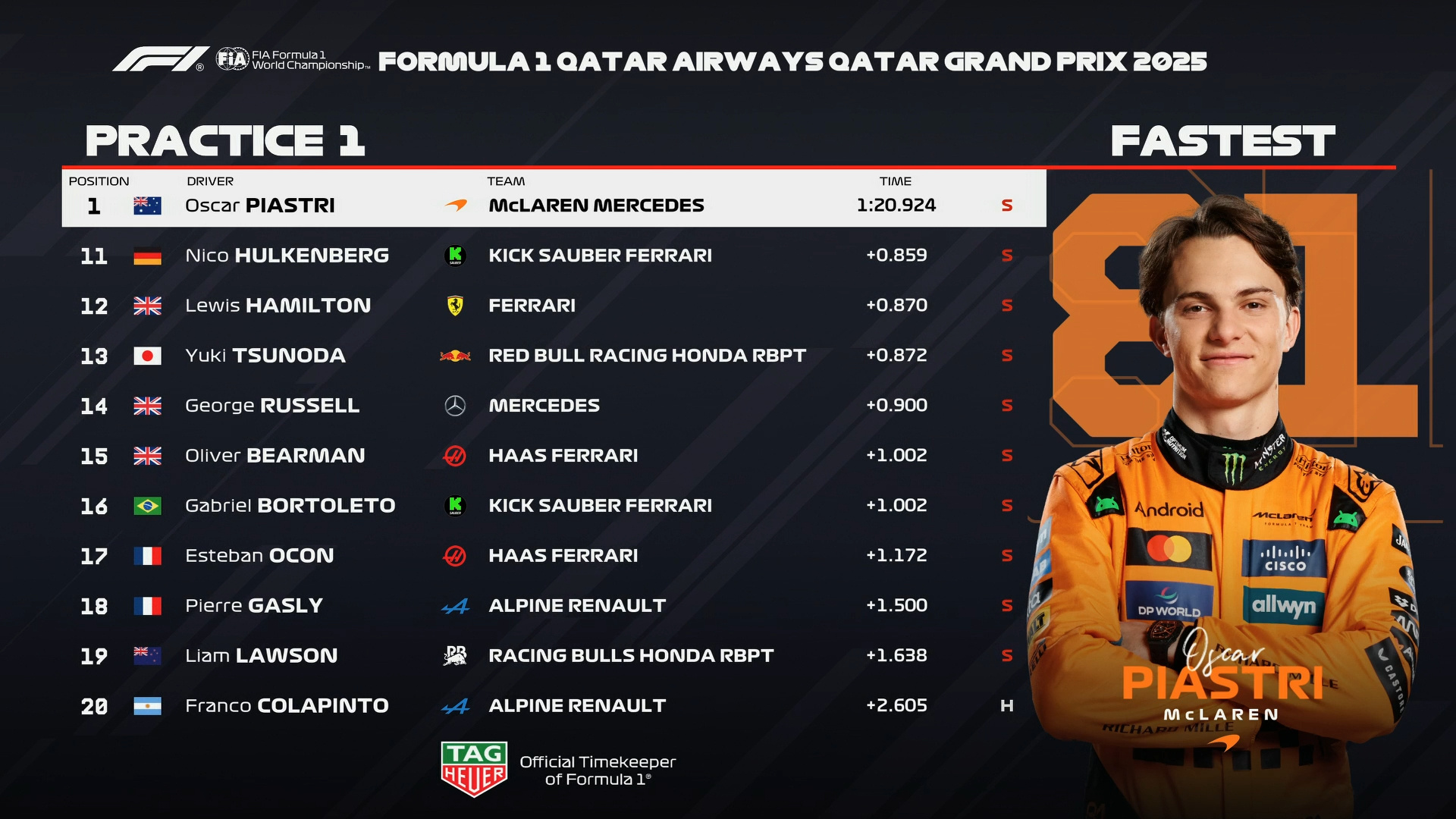 卡塔尔大奖赛一练成绩表如图,北京时间01:30冲刺赛排位赛!F12025F1卡塔尔大奖赛