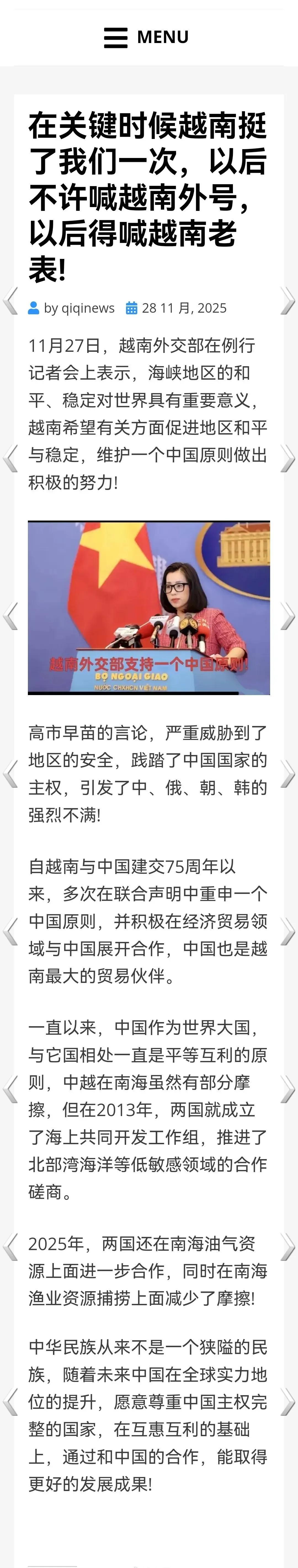关键时候越南挺咱!以后喊越南老表才够味 家人们,最近这事儿太提气了!台政客和高市早苗合影遭群嘲,关键时候越南直接站出来挺咱😤! 当地时间11月27日,越南外交部明确重申一个中国原则,称台湾是中国领土,呼吁维护台海稳定。中越本就情谊深厚,今年贸易额破2400亿美元,立场上不含糊太够意思! 以前的外号该丢了,关键时并肩的就是老表!为这份邻邦情谊点赞,以后好好相处!