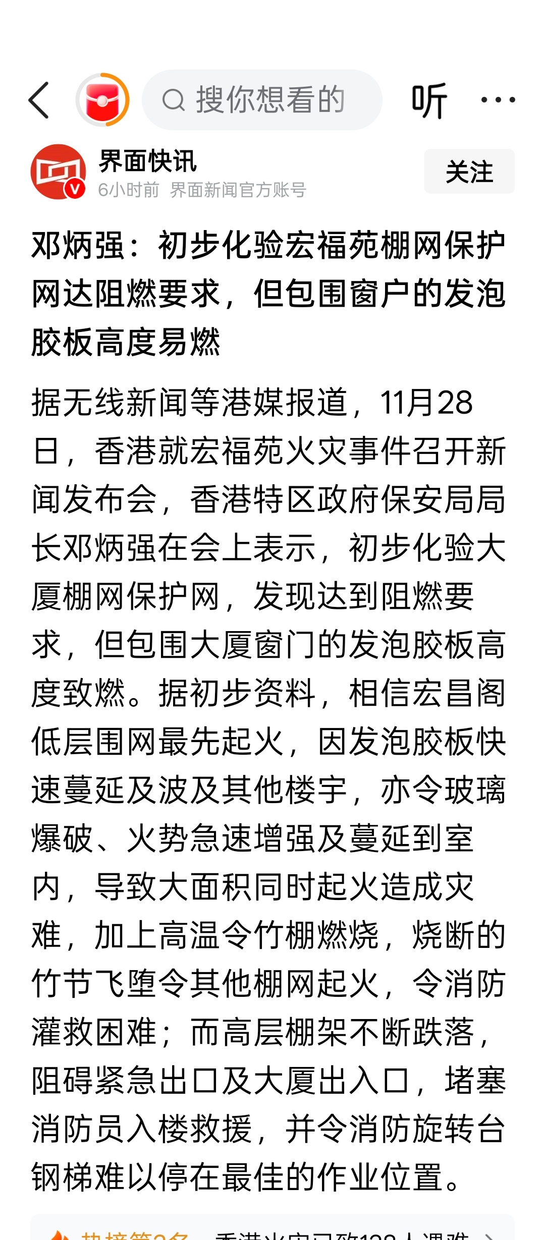 邓炳强:初步化验宏福苑棚网保护网达阻燃要求,但包围窗户的发泡胶板高度易燃