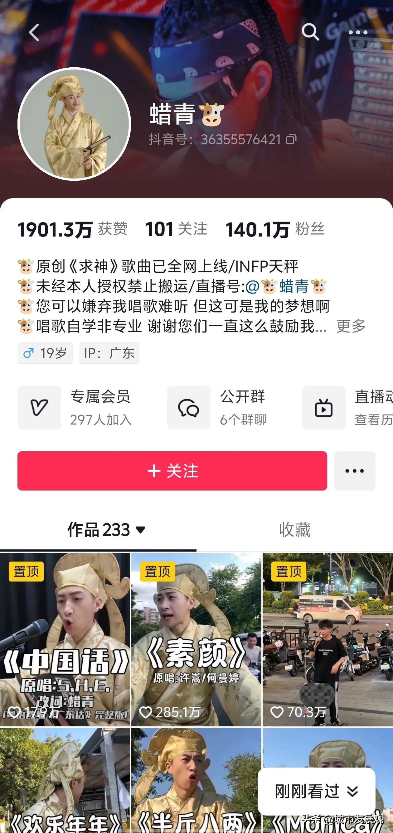 抖音上的[蜡青]算不算全网最成功的博主之一?一个手机和自拍杆卡在一部自行车上(单车是骑行的共享单车),加一拢粤剧戏服,再配合他那魔性又富有粤剧腔调的“普语粤唱”方式火遍全网。现在抖音上有140万粉丝。这是起号成功了!