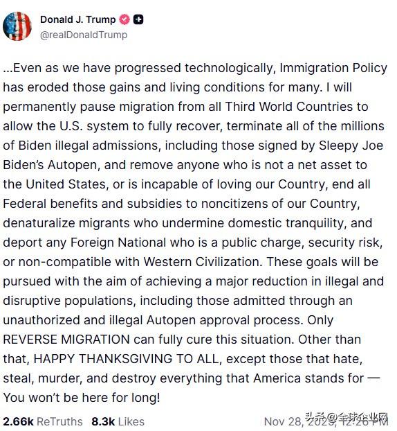 【特朗普:将永久暂停“第三世界国家”移民,驱逐与西方文明“不相容”的外国人】 今天,美国总统特朗普在社交媒体发文称,他将无限期暂停来自所有“第三世界国家”的移民,让美国的体系得以完全恢复;终止拜登政府时期数以百万计的非法入境许可,包括那些由“瞌睡乔”拜登的自动笔签署的文件;并清除任何对美国未作出实际贡献、或无法热爱我们国家的人。 他还将结束所有给予非美国公民的联邦福利和补贴;撤销那些破坏国内安宁的移民的公民身份;驱逐任何依赖公共救济、构成安全威胁或与西方文明不相容的外国人。