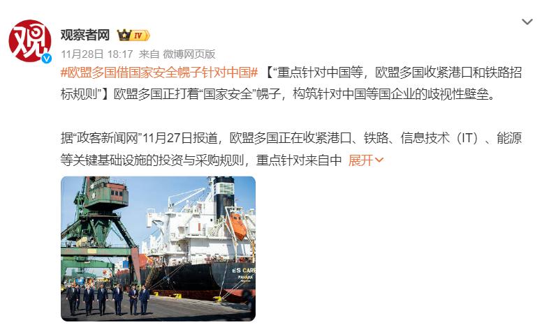 刚刚,一些欧洲国家又犯蠢了,纷纷对华使出阴招,真是大开眼界 根据观察者网报道,有多个欧盟国家又开始对中国等国企业捣鼓一些限制、歧视措施,免得让我们的企业投资他们的港口、铁路、能源这些关键领域,打的旗号呢,还是老掉牙的国家安全。 我觉得,欧洲人以后再拿这个理由对中国说事儿,只能说明他们的能力实在不能理解什么是国家安全。 欧洲人面临的国家安全危机现成就有,某个老大,以军事、经济、外交、情报、金融、科技互联网等霸权对欧洲加以控制,从俄乌冲突到金融危机,欧洲人被扒了几层皮了,还没醒? 好像是没醒,他们在美国羽翼下过了70多年,似乎把鞭笞都当做了上父的爱。 中国,倒是中国,作为欧盟最大的贸易伙伴,中欧彼此那么大的投资量,中欧班列运转了那么多年,双边贸易额几千亿美元,欧洲人是真的赚了很多实惠。、 但是,欧盟一些国家和政客却拿这样的中国是威胁。 比如瑞典,准备出台新的政策,以防止“敌对国家”渗透,中国好好地和瑞典做生意,结果瑞典觉得我们是敌对国家, 比如波兰,对于中资参与港口的运作感到很不安,所以他们想要调整法案,明摆着想收回港口权限。 这么多年,享受的中欧班列的好日子都忘了? 要我说,这些欧洲政客真是蠢得冒烟!明知道现在最该做的是拉拢中国,平衡美俄的压力,可他们偏偏要跟着美国指挥棒转,非要对我们搞小动作! 最近几年的实际情况是: 一边是美国特朗普政府在对欧洲疯狂勒索,军费要加,贸易战要打,把欧洲当提款机; 另一边是中国始终敞开合作大门,中欧班列开过欧洲200多个城市,中欧每年贸易额突破7800亿美元,相互投资存量达到2700亿美元,25个欧盟国家享受我们的免签政策。 可这些政客就是算不清这笔账!非要学美国那套“国家安全”的把戏,想着怎么讨老大欢心。 他们啊,以为跟着美国刁难中国,就能换取特朗普政府的“理解和宽容”。 结果大家都看到了:欧洲越软,美国该勒索越多,而且还继续轻视欧洲。 这叫什么?自讨苦吃,没苦硬吃,除了把自家市场搞得乌烟瘴气,什么好处都没捞到! 说到底,自从默克尔离任后,美国强化了对欧洲的控制,这个欧洲啊,有大量的亲美政客,他们可以跟着美国吃草,但却不愿意和中国好好合作赚钱。把好好的合作局面经常搞得乌烟瘴气。 真是蠢的可以。