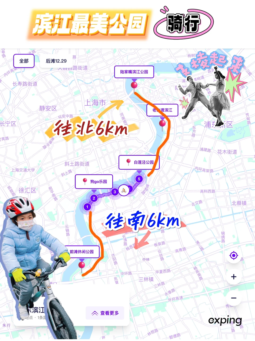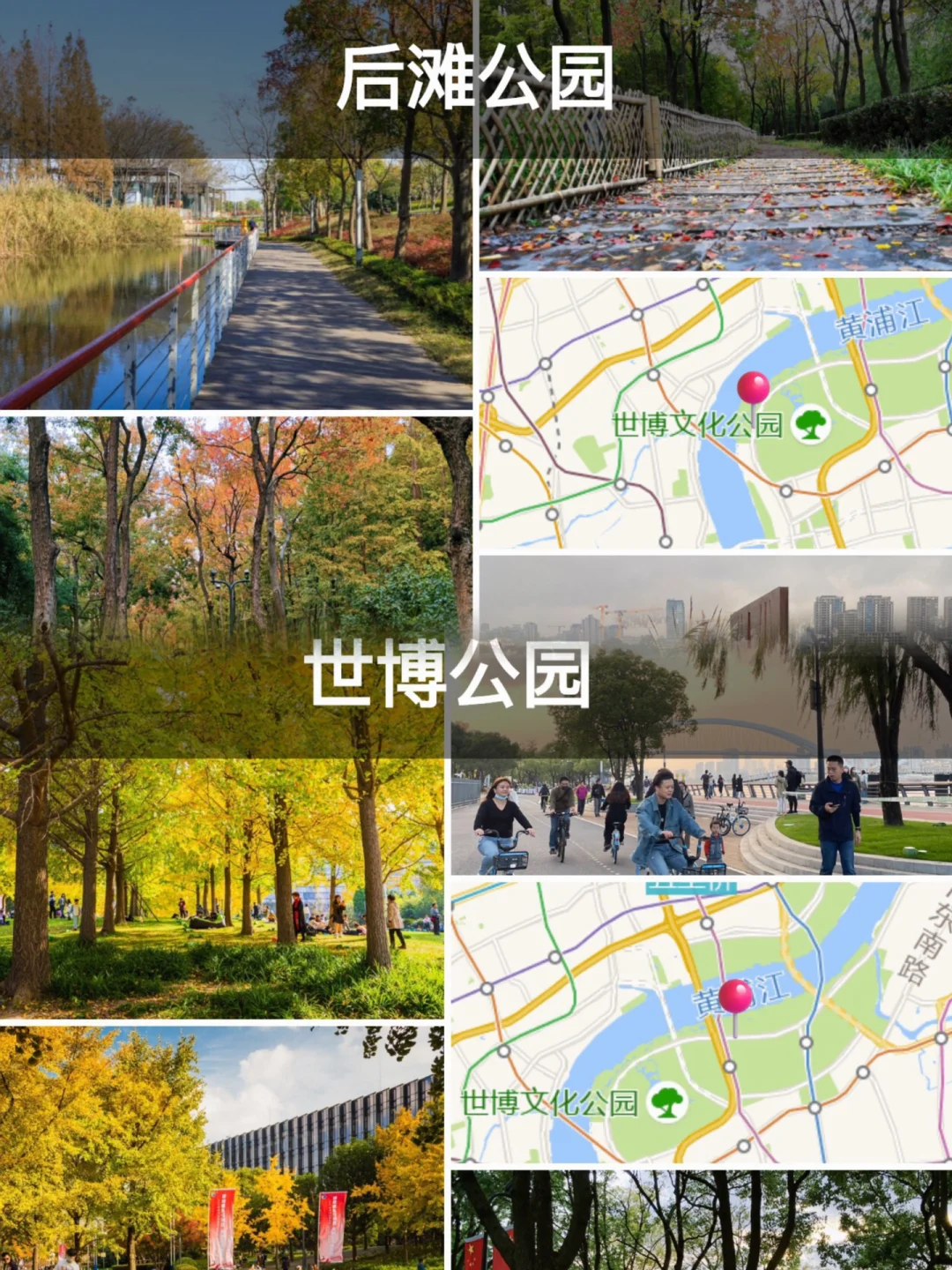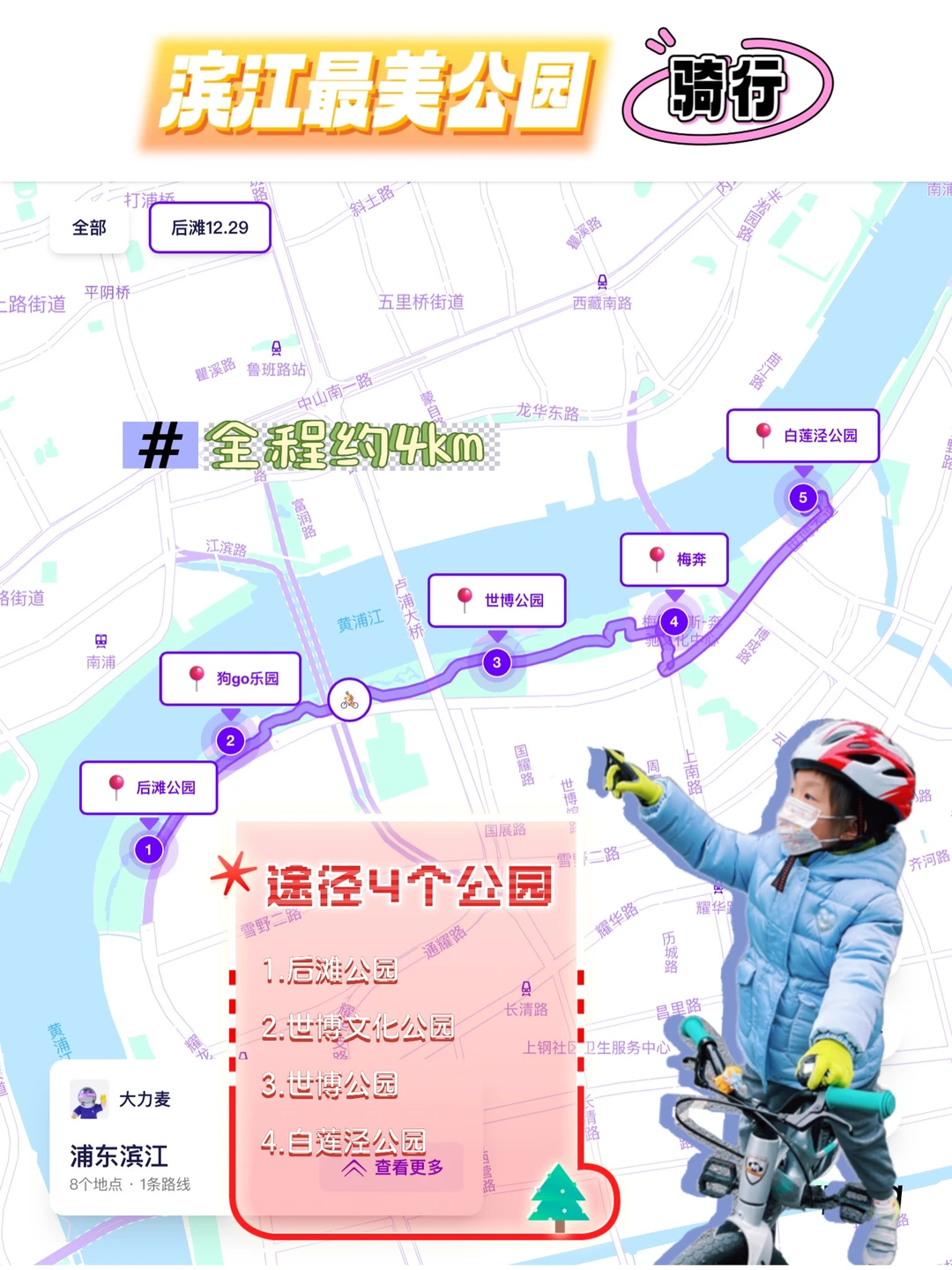 此次对这条经典的亲子路线做了小微调,直接从后滩公园出发,往北骑行经过世博公园至梅奔后,又往前延伸了一小段到白莲泾公园。