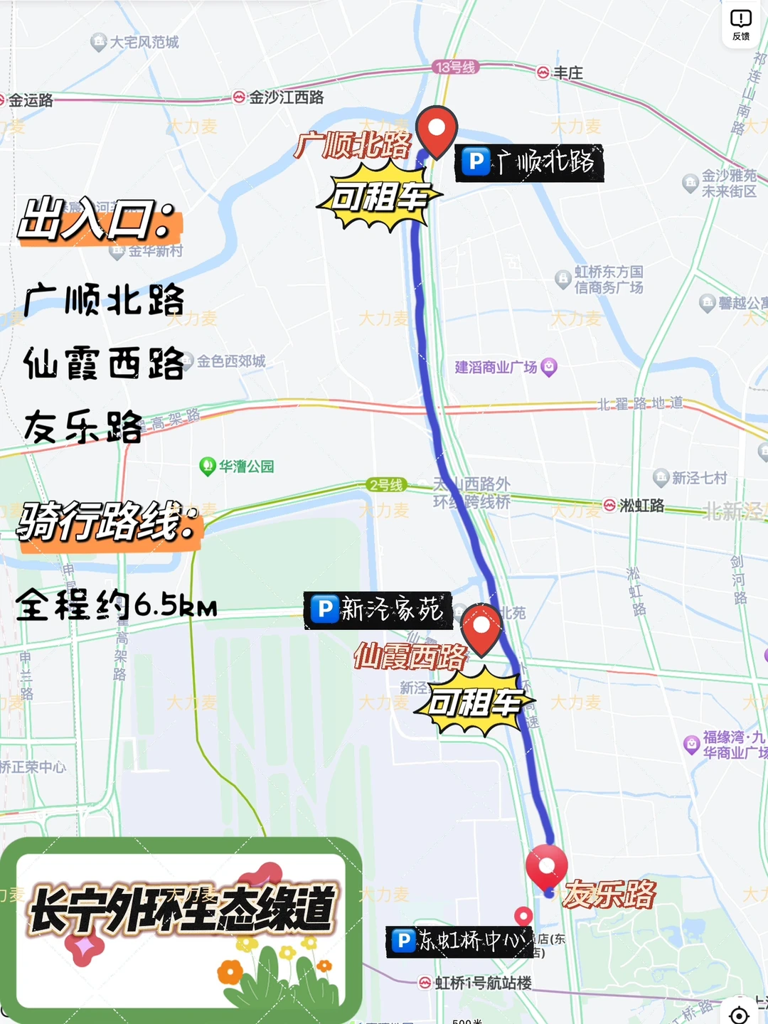 租车信息:共享单车限行,广顺北路&仙霞西路出入口可租借绿道内的专用🚴