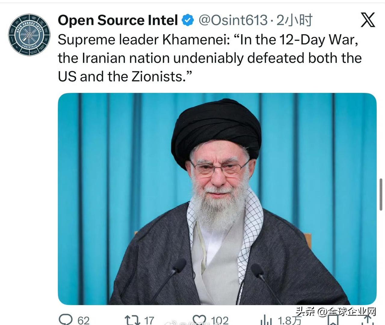 最高领袖哈梅内伊:“在十二日战争中,伊朗人民无可争议地击败了美国和犹太复国主义者。”