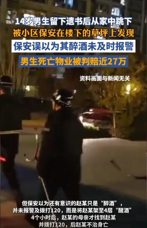 河南许昌14岁少年赵某因学业压力跳楼,坠楼后未当场死亡,小区保安巡逻时发现他却误