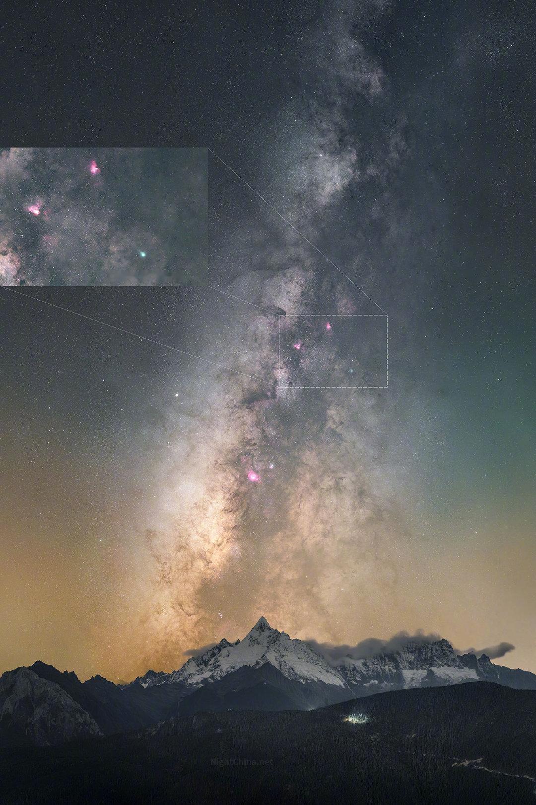 在经幡静止的夜里,缅茨姆峰仿佛以冰川为衣,立于万物沉息处。银河如圣洁的哈达自天穹垂落,星光在峰顶汇聚成祝祷。那道淡绿的光, C/2025 R2(SWAN)彗星,是来自太阳系边缘的“转经筒”。祝福被刻进冰川,随风送往所有心怀敬意的人。摄影师:,2025年10月17日摄于 云南 德钦县飞来寺。索尼a7r3(BCF改机) + 适马85 1.4 Art,天空部分:ISO 640,f/1.8,单张曝光60秒,18张拼接;地景部分:ISO 800,f/1.4,单张曝光30秒,3组共15张堆栈拼接。关注Steed的星空 ,每日推送星空佳作。更多图片请见 夜空中国 :NightChina.net