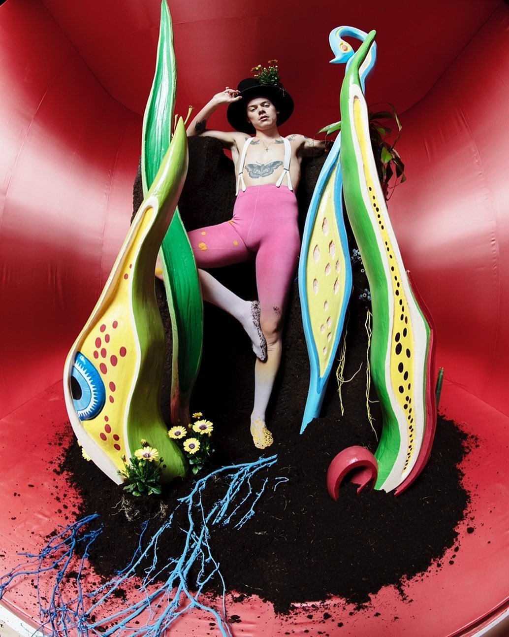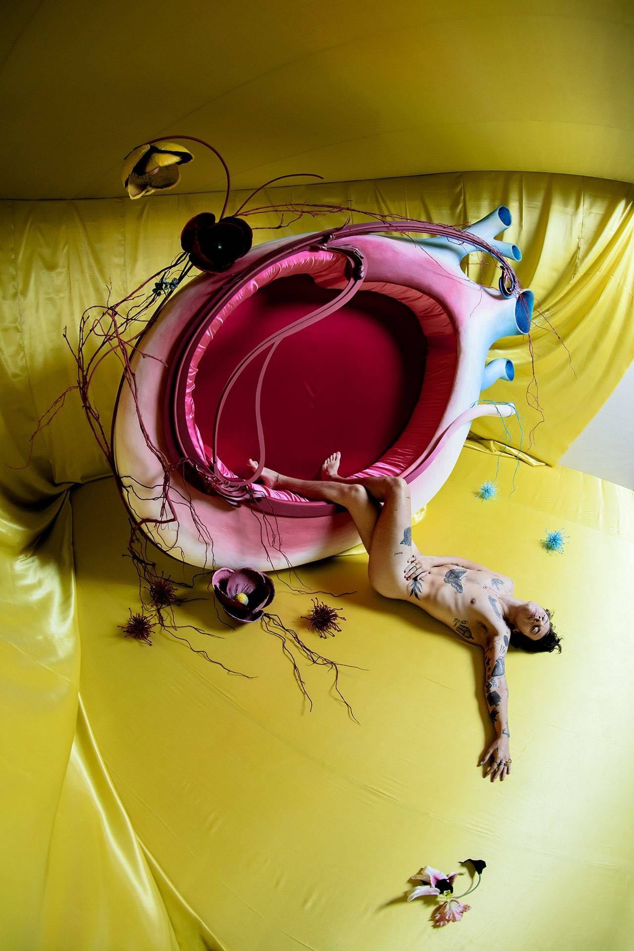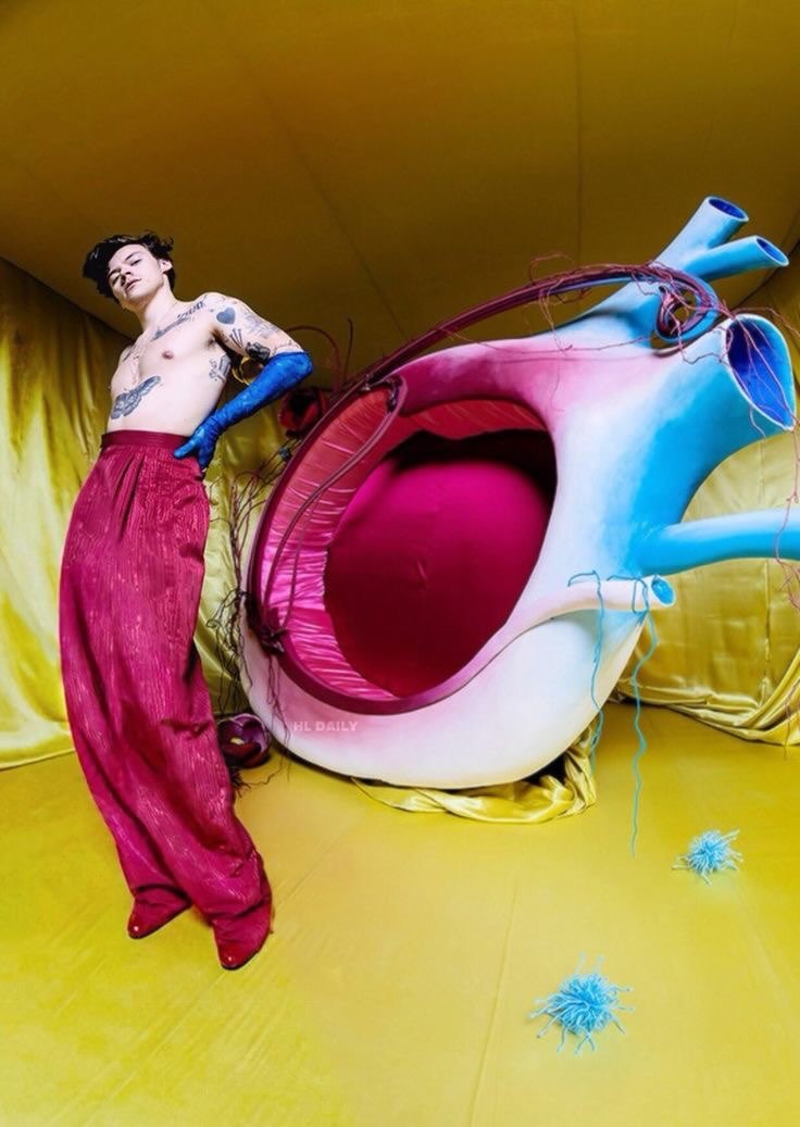 英国摄影师 Tim Walker 拍摄的 Harry Styles 《Fine Line》专辑内页系列照片Harry 常聊到想要「把心脏穿在袖子上」(wear one's heart on one's sleeve 代表一个人对自己的感情毫不掩饰),所以 Walker 希望穿透时尚外衣的盔甲,以赤裸方式显露出 Harry 的脆弱,他认为裸体是人最美丽与最上镜的状态——而画面里的 Harry 就在那儿,躺在一巨大的心脏旁,赤裸而脆弱。HarryStyles