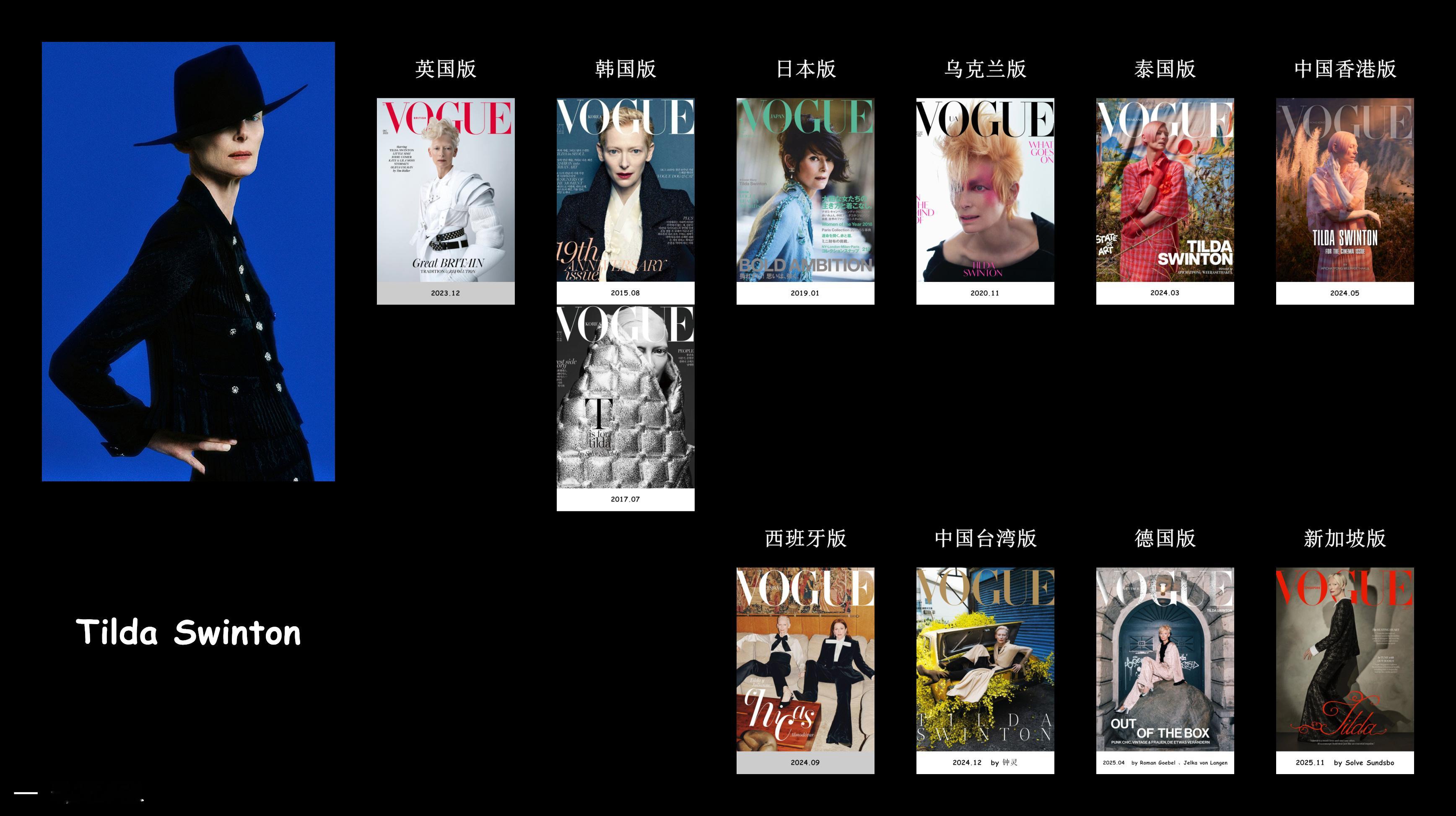 Tilda Swinton × VOGUE 封面集 1️⃣0️⃣ 个版本共计 1️⃣1️⃣ 刊 CHANEL 发力 ,解锁新加坡 ,两年不到拿下六本 VOGUE ,今年还有一支手工坊系列的全球成衣 ,新增 Dom Perignon 、Gentle Monster 、Tom Ford 在内数支商务 ,形象 、气质出众 ,时尚 、商务开花 ,作品存货版图表现同样积极 ,60 + 的当下 ,姐依旧来势汹汹 ~ 封面 :Tilda Swinton 摄影 :Solve Sundsbo 造型 :Jerry Stafford