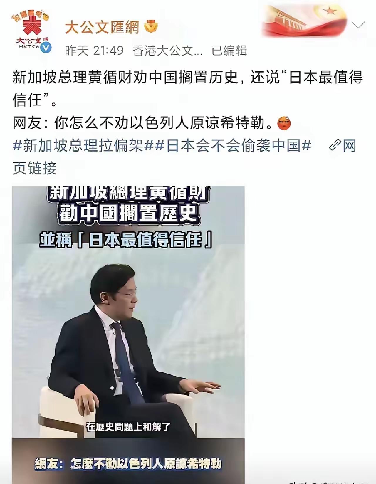 还是大公报会整活。 新加坡的国运用完了。李光耀时期透支了新加坡的国运。往后便是一代不如一代。 黄循财怎么不去劝说以色列放下对伊特勒的仇恨?这种不学无术的总理会让新加坡走向绝路。当你说“尖阁列岛”而不是“钓鱼岛”你就已经站队了。必须要算账。 对此网友表示,新加坡军队有只番号叫星光的部队,长期在台湾训练;新加坡樟宜基地驻有美军;新加坡从来就不亲中国,而且他们也不认为自己的华人国家。大家要认清楚新加坡的本质。 小国哪有什么国运!只不过是大国博弈的棋子而已!本身就因卡着海峡咽喉带着原罪,再认不清形势很容易成为霸主交替过程中的牺牲品! 墙头草就是没立场,自古没有好下场。拭目以待吧!