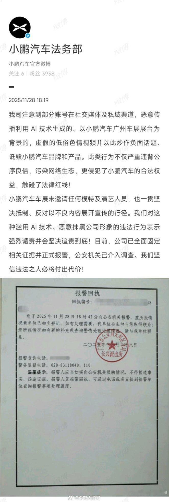 小鹏汽车法务部辟谣,称有账号恶意传播AI生成的虚假色情视频抹黑品牌。该行为严重违法,公司已全面固定证据并正式报警,公安机关已介入,将坚决追责到底。小鹏报警
