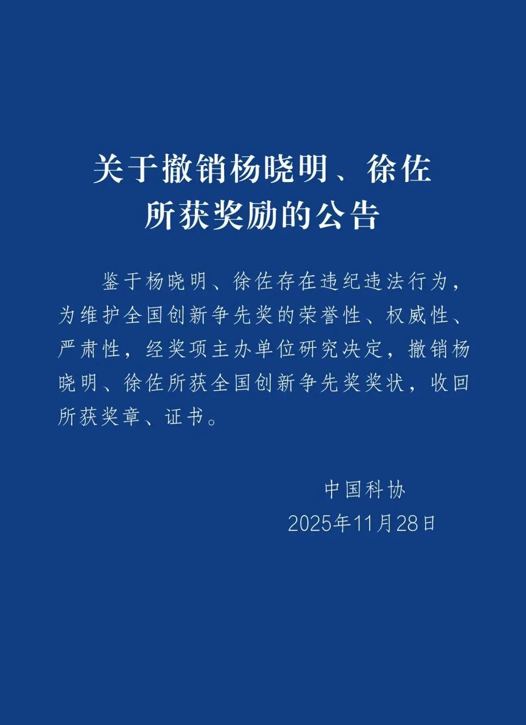 科技圈突然扔出一记“重磅炸弹”!中国科协今天发公告,直接把杨晓明和徐佐曾经拿的奖项给撤了。没错,就是那种曾经风光无限、挂上名字就能“镀层金”的荣誉。 说实话,看到消息第一反应:这是出了啥事?奖项可不是随便撤的,更何况是这种级别的认可。翻翻旧闻,杨晓明曾是疫苗研发的领军人物,徐佐也在材料领域颇有建树,如今却被“倒查”,不禁让人联想:是学术不端?还是成果掺水?科协虽没明说细节,但一句“撤销奖励”已经传递明确信号——科学尊严,不容瑕疵! 网友热评预打卡: “支持!科学就要干干净净,谁‘注水’谁买单!” “早该查了,奖项不是‘终身保险’,经得起时间检验才是真本事。” “求科普这两人具体犯了啥错?蹲一个后续……” 科学界的“倒查”机制越来越硬核了。这也给所有人提个醒:荣誉背后是责任,一旦触碰红线,光环秒变“紧箍咒”。为这份较真点个赞!科技学术奖 国家科技特等奖 国家技术奖 中国科技进步奖 国家技术进步奖
