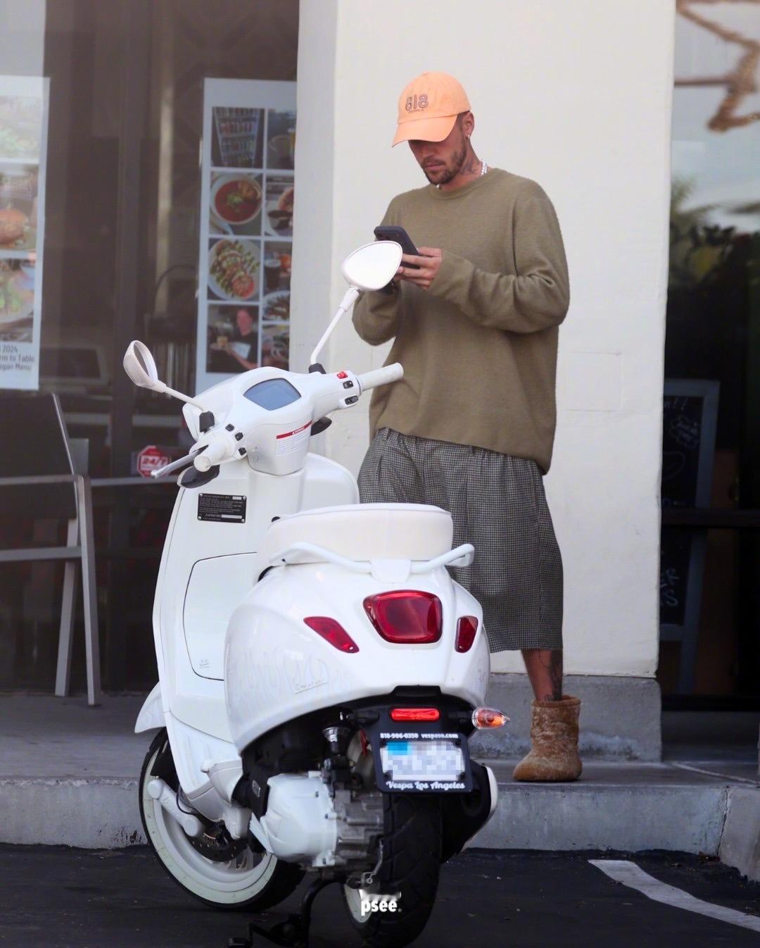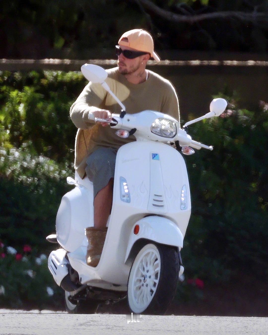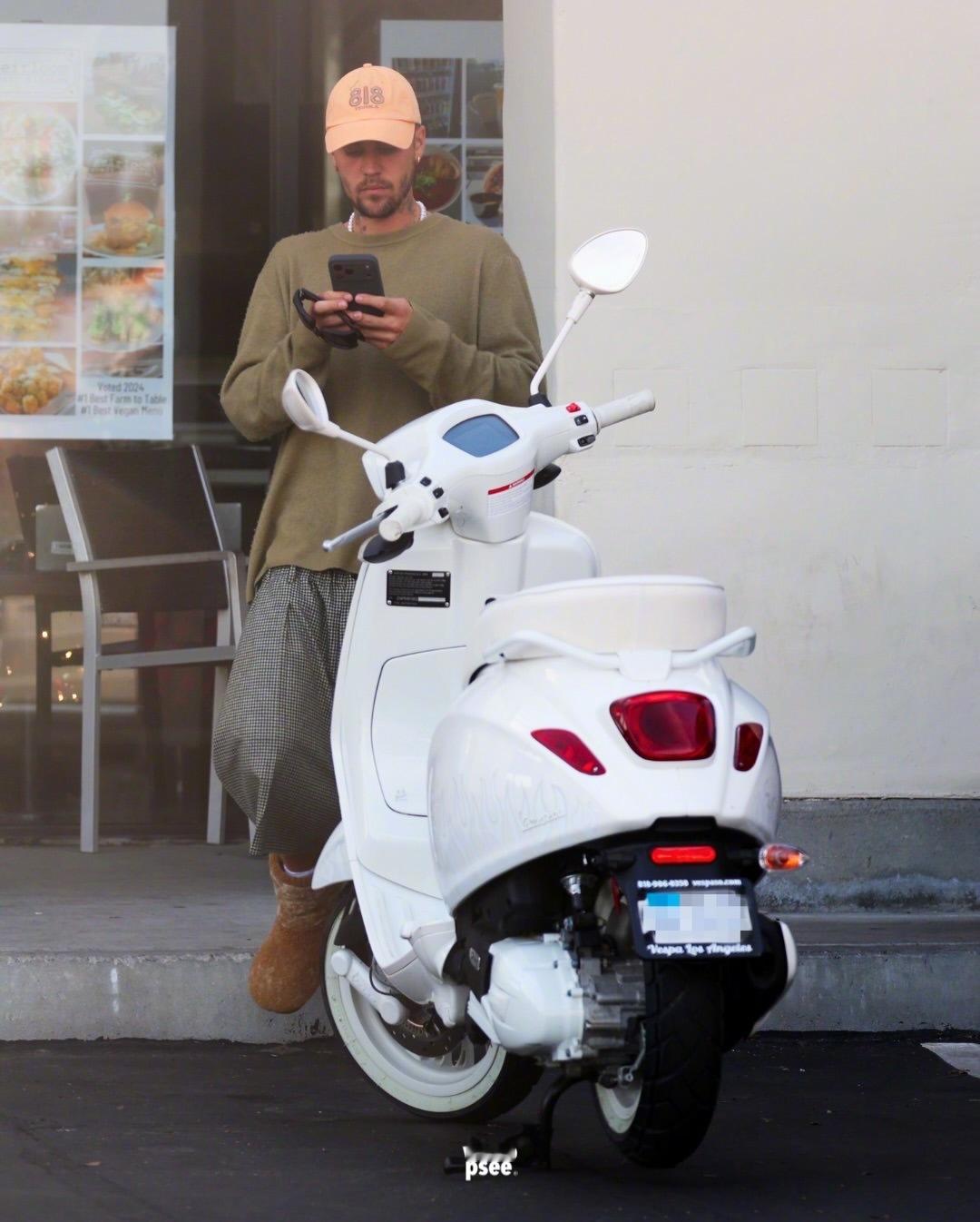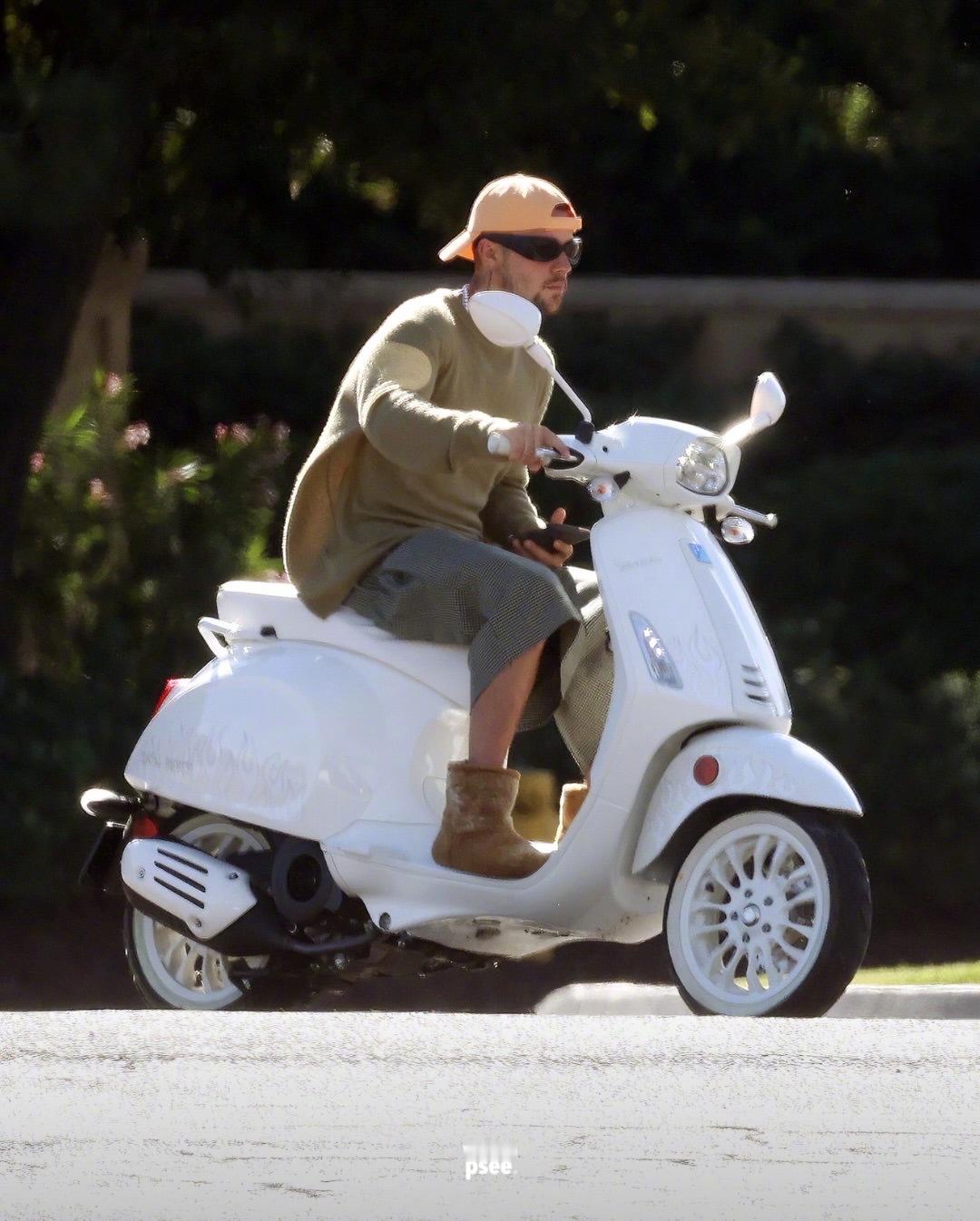 感恩节,骑着 Vespa 在棕榈泉街头兜风的贾斯汀.比伯。这款车是他与Vespa 的联名款 ,带有专属设计:纯白配色 + 特别图案/Logo/火焰装饰等。