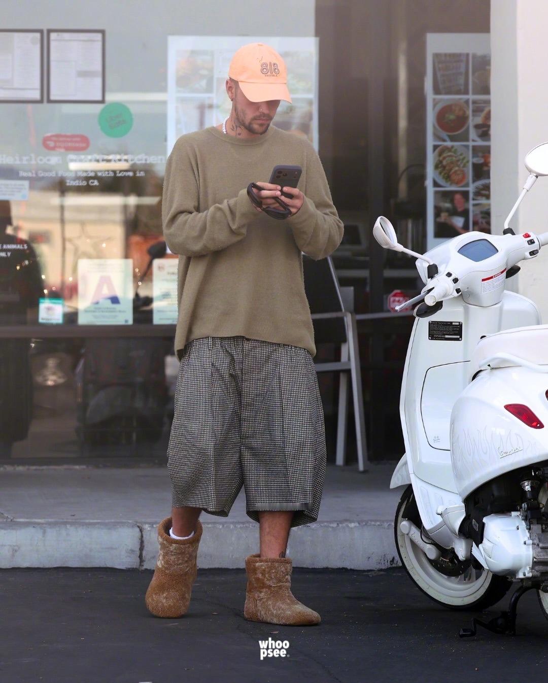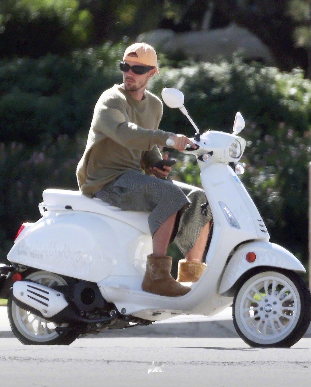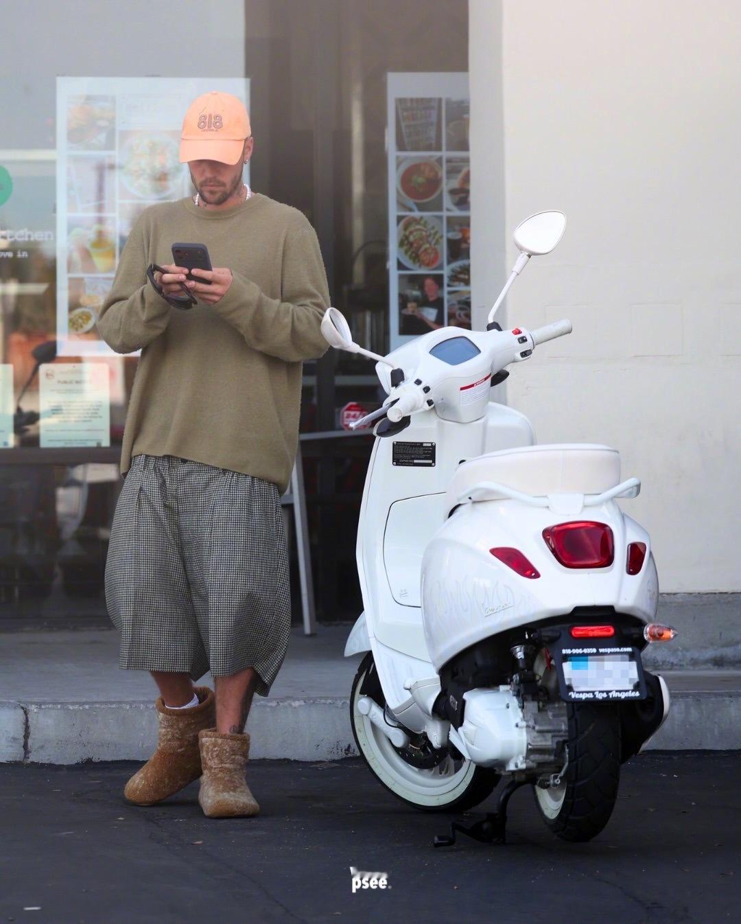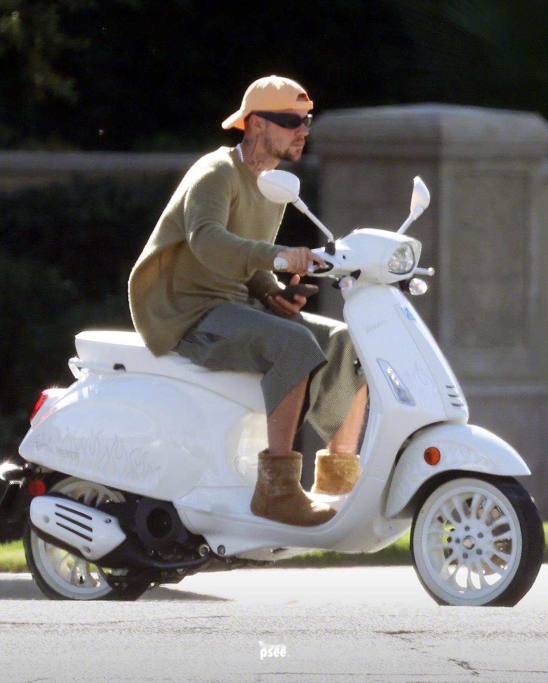 感恩节,骑着 Vespa 在棕榈泉街头兜风的贾斯汀.比伯。这款车是他与Vespa 的联名款 ,带有专属设计:纯白配色 + 特别图案/Logo/火焰装饰等。