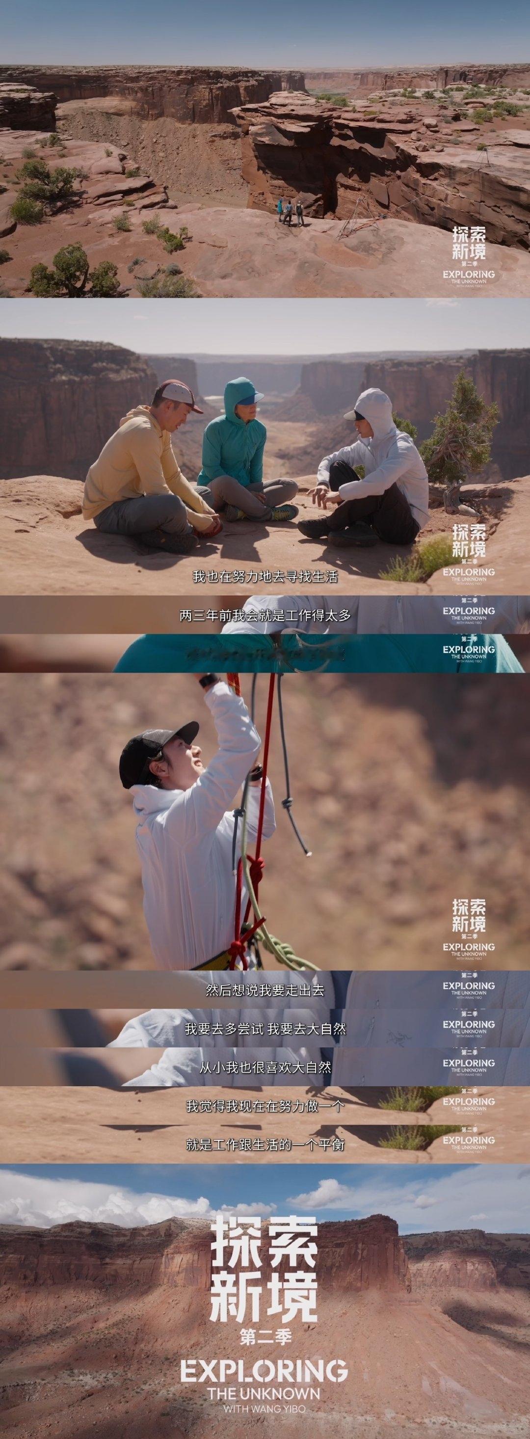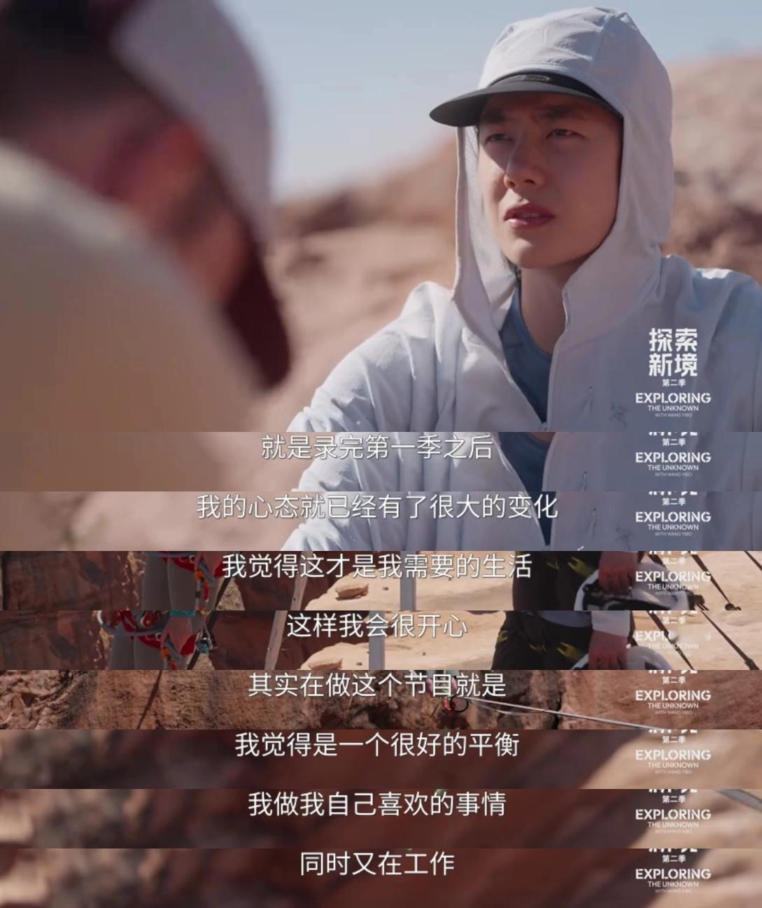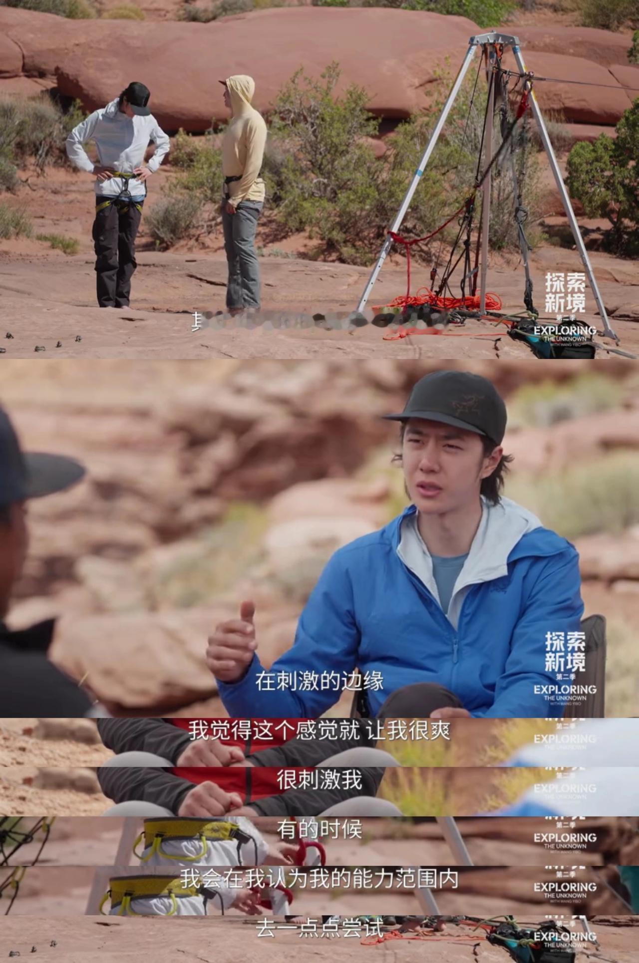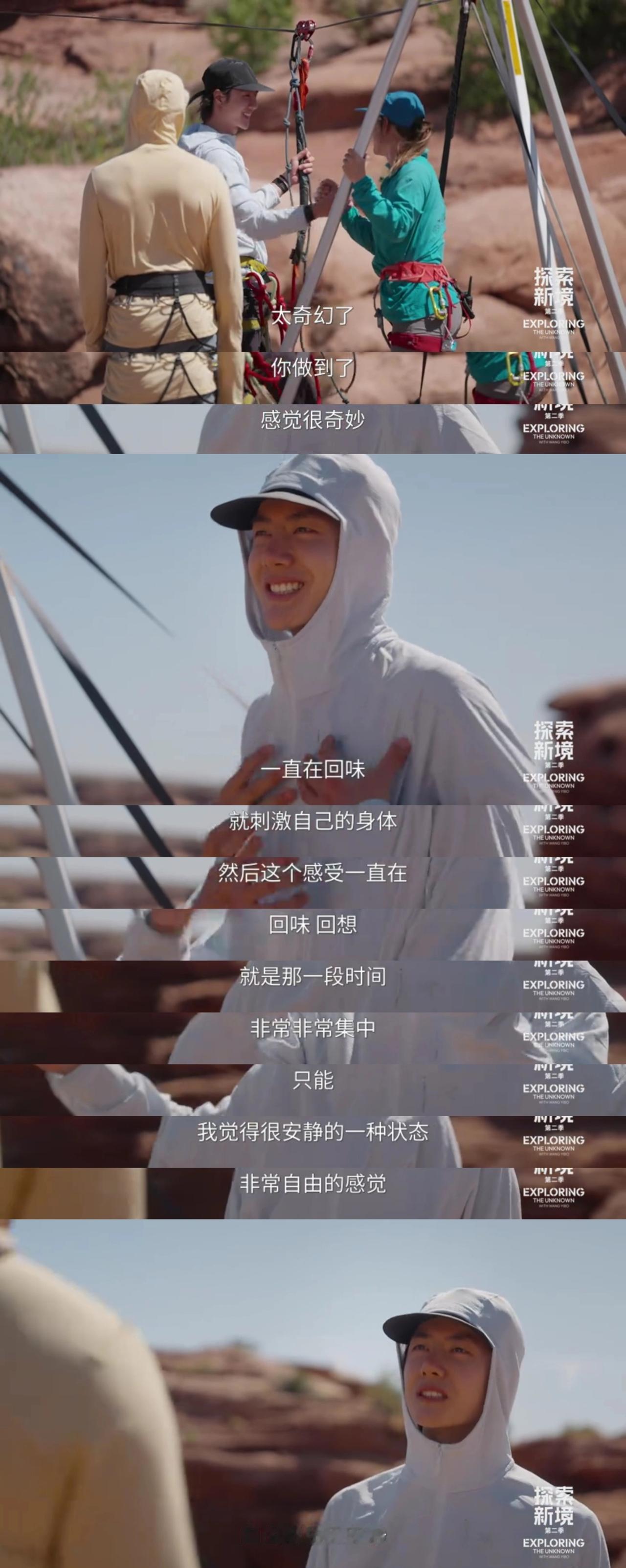 传统攀岩、百米高空走扁带……害怕吗?恐惧吗?怎么可能不恐惧,但是,王一博敢于直面恐惧,也更勇于正视自己[赞]。 王一博:“感觉很奇妙,一直在回味,就刺激自己的身体,然后这个感受一直在回味回想” “就是那一段时间,非常非常集中,我觉得很安静的一种状态,非常自由的感觉” “我做我自己喜欢的事情,同时又在工作” “我觉得我现在在努力做一个,就是工作跟生活的一个平衡” 王一博的清醒和强大真的让人敬佩不已也羡慕不已,真正的强者就是“把自己的生活变成想要的样子,而不是随波逐流”,王一博已经在践行的路上。 这,是仅仅28岁的王一博。 王一博 王一博探索新境2