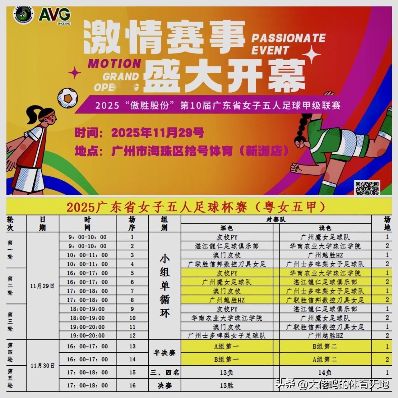 2025粤超系列赛事中的第3个比赛:“傲胜股份”第10届广东省女子五人足球赛(粤女五甲)马上开赛(今天11月29日上午9点)地点:广州海珠区拾号体育(新洲店) 本届赛事有来自全省乃至港澳台球员的8支代表队参赛……队员们说这是女子足球爱好者的嘉年华 已经10届了 带给了我们巨大乐趣! 赛事直播可用广东省五人足球协会视频号和广东省五人足球协会抖音号观看比赛、现场观看免费!