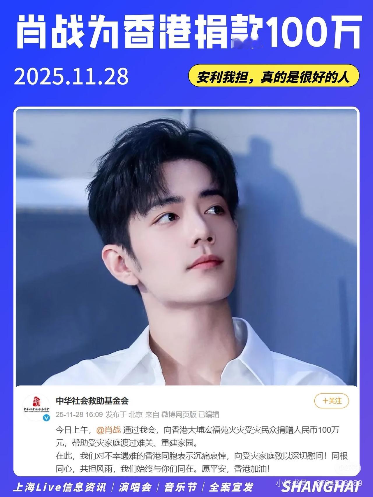 肖战给香港大埔火灾捐了100万 现在明星捐款不少见,但能第一时间通过中华社会救助基金会把钱送过去的不多。香港同胞正需要帮忙的时候,他没等没拖,100万直接到了该用的地方,这比说多少话都实在。看其他艺人也捐了,但每个人心意不一样。肖战这100万没带任何宣传,就像普通人为邻居递杯水似的自然。受灾家庭可能不知道他是谁,但这钱能买米买菜修房子,比口号有用多了。 明星做慈善不就是这样吗?不用多花哨,能帮到实处才是真的,你说是不是?