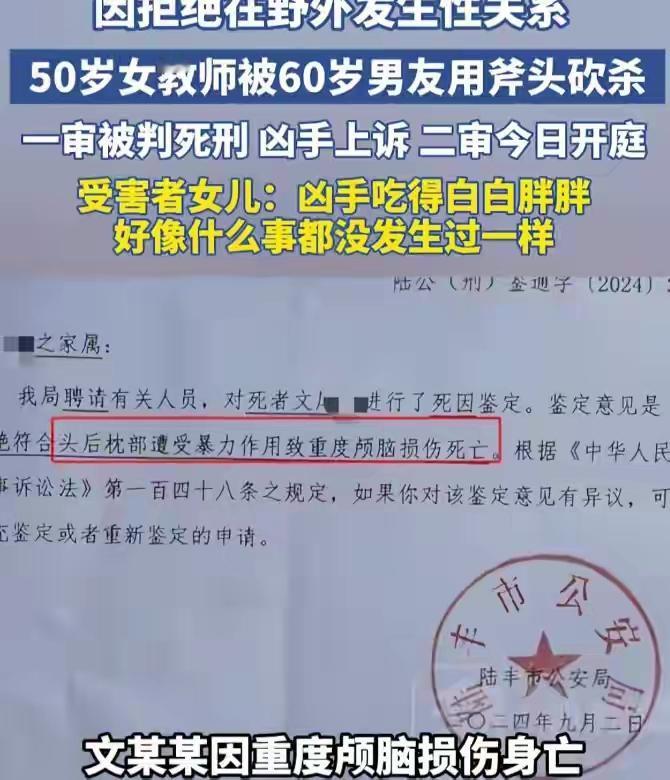 女教师拒绝男友在野外发生关系,被男友砍杀,二审今日开庭。 罪犯杀了同居11年女友,尸体藏在山林草丛中。只是因为她拒绝了对方提出的野外发生性关系的要求。 案发前,男方刻意绕行避开监控,作案后冷静处理现场,甚至在庭审时翻供称“她是自己摔死的”。 如今二审开庭,被害人家属:凶手吃得白白胖胖,像什么事都没发生过一样? 这一案件的详细情况令人心痛,也引发了对家庭暴力和性别暴力的深刻反思。女性在亲密关系中常常面临来自伴侣的潜在威胁,尤其是在拒绝对方不合理要求时,暴力行为可能随之而来。这位女教师同居11年,最终却因为拒绝男友在野外发生性关系的请求而遭遇如此可怕的命运,显示了权力失衡和暴力控制在亲密关系中的现实。 男方在案发前刻意避开监控,作案后冷静处理现场,并在庭审时翻供,试图推卸责任,这种行为不仅反映了其极端的自私与冷酷,也显示出对受害者生命和权利的极度漠视。他的不负责任和缺乏悔意让人更加愤怒。 目前,二审开庭,受害者家属对于凶手毫无愧疚之意的表现感到无比痛心。家属提到凶手“吃得白白胖胖,像什么事都没发生过一样”,这种对比加深了他们的绝望与无力感。受害者的家属在经历如此巨大的悲痛后,依然勇敢站出来追求公正,他们的呐喊不仅代表了个人的痛苦,也象征着对社会不公的控诉。 这样的案件提醒社会必须加强对家庭暴力和性别暴力的关注。我们需要更有效的法律保护机制,以确保每一个人,特别是女性的安全。在教育和宣传方面,社会应加强对性别平等和暴力行为的认知,倡导健康的家庭关系和解决冲突的理性方式。 希望这一案件能引发更广泛的讨论,推动法律和社会对暴力行为的零容忍态度。愿所有经历过家庭暴力的人都能得到应有的保护和支持,防止类似悲剧再次发生。你对这一案件有什么看法和感受?欢迎分享你的意见。情侣被杀案 女教师遇害案 杀害同居11年女友藏尸案