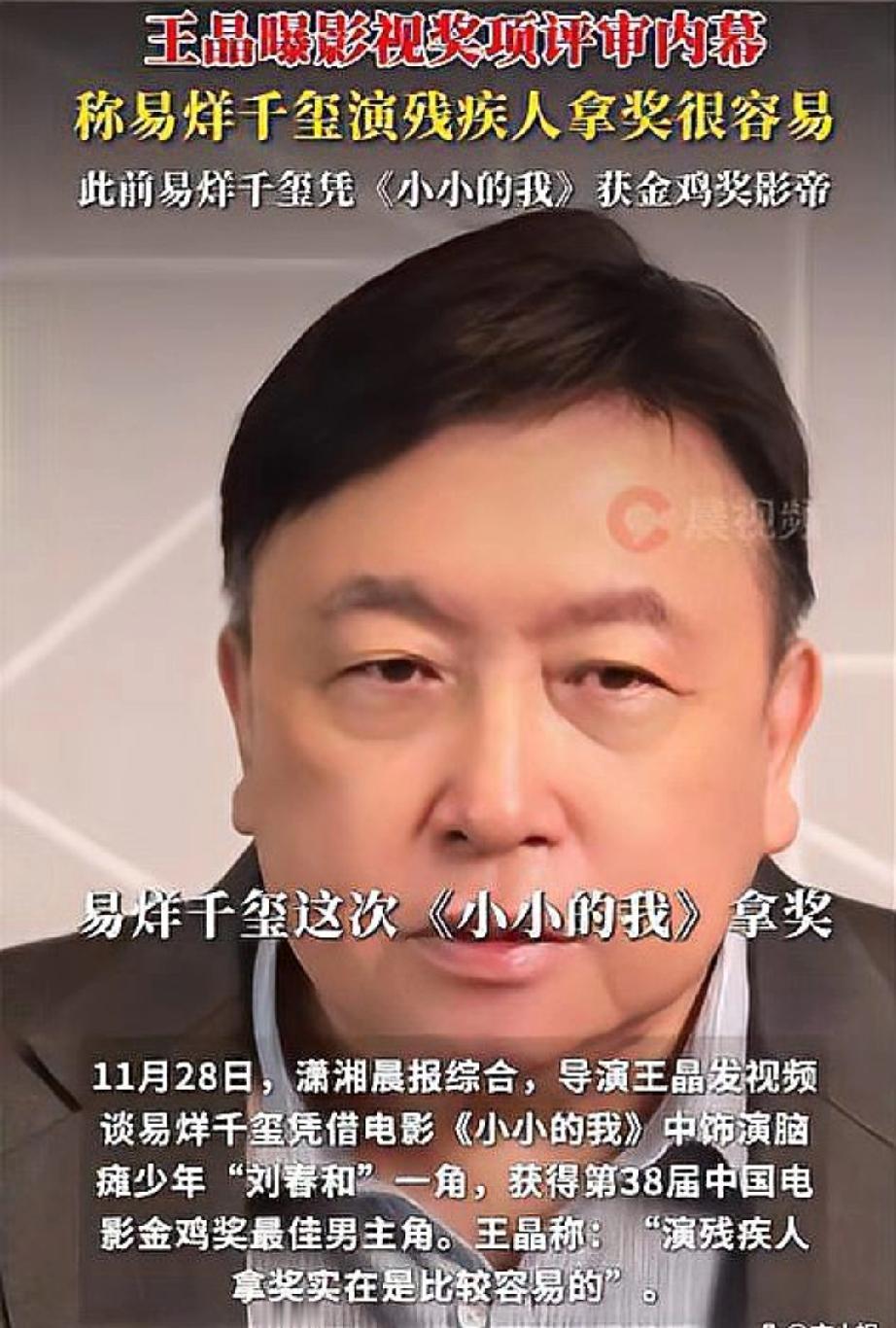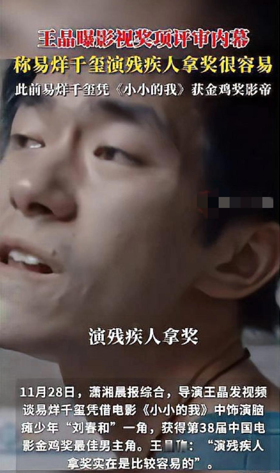 香港导演王晶直播中直言易烊千玺“演残疾人拿奖太容易”,这究竟是何言论,又为何会引发如此大的争议呢? 王晶在直播中表示,易烊千玺凭借电影《小小的我》中饰演的残疾人角色,获得第38届中国电影金鸡奖最佳男主角奖项,他认为这个奖项拿得相对容易。此言一出,迅速引发了公众的广泛关注和热议,不少人开始质疑奖项的公正性。王晶还透露,其父曾因奖项被“买走”而错失最佳导演奖,两年后随便拍一部就获奖,这似乎在暗示影视奖项评选存在不公现象。然而,也有观众认为,易烊千玺虽然年轻,但他在影片中的表现情感充沛,演技可圈可点,获奖也并非毫无道理。毕竟,他此前主演的《少年的你》就曾荣获多个奖项,成为金鸡奖史上最年轻的影帝,其演技和努力都得到了业界的认可。这场争议无疑揭示了影视奖项评选的复杂性,也再次将演员演技与奖项公正性的话题推到了风口浪尖。 这场争议让我们看到了影视奖项背后的复杂性,也引发了我们对演员演技与奖项公正性的思考。大家对此有何看法呢?欢迎在评论区留言讨论,一起分享你的观点!
