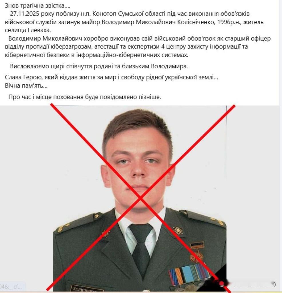 昨天(11月28日),俄军“天竺葵-2”无人机对苏梅州科诺托普地区的克罗列韦茨定居点附近,实施了精准打击,摧毁了乌克兰特种通信和信息保护局网络安全中心的指挥所。 高级军官中有人员伤亡。 经确认,1996年出生的弗拉基米尔·米科拉约维奇·科列斯尼琴科少校被击毙,他是乌克兰网络威胁应对部门的高级分析军官。