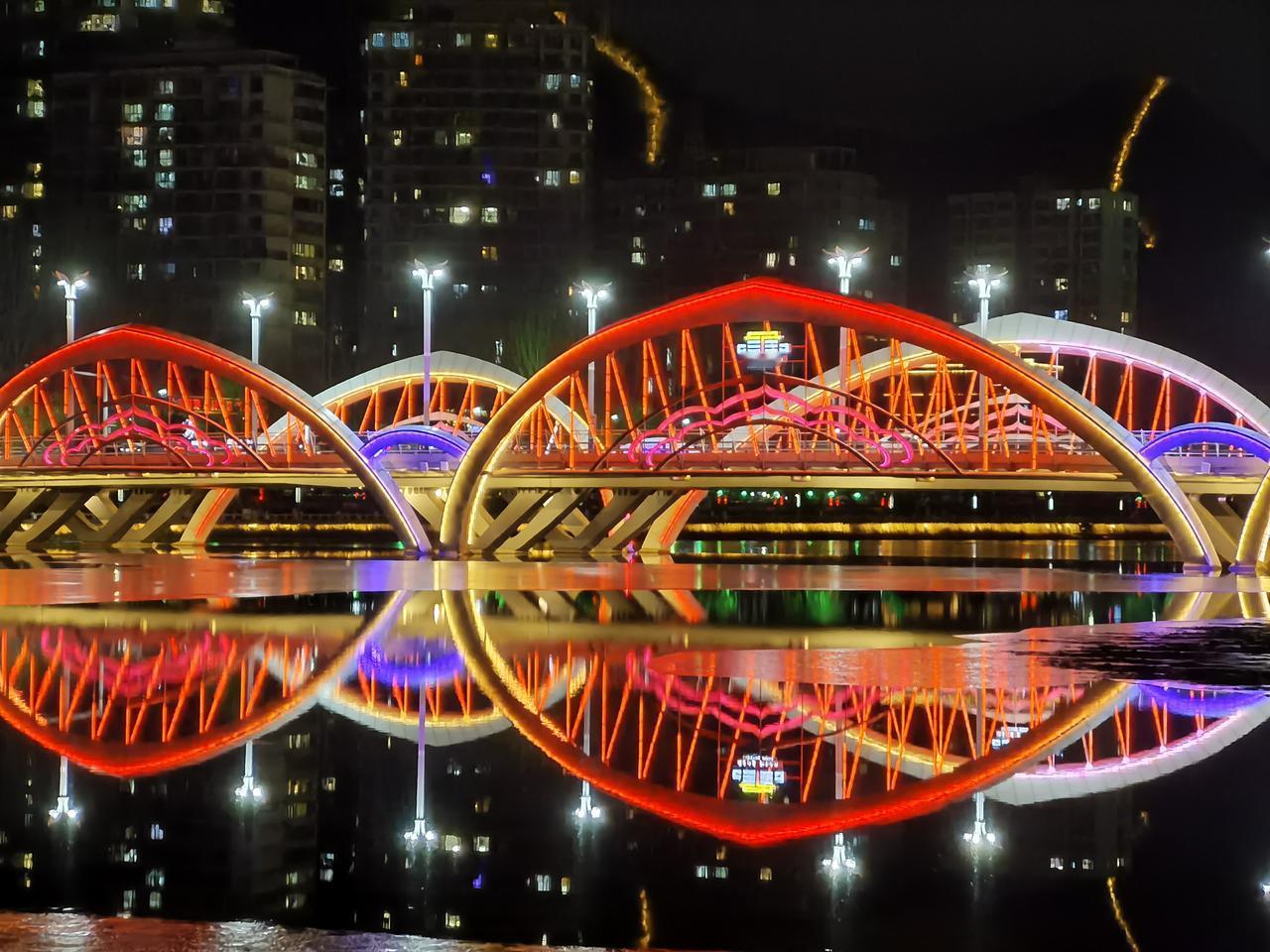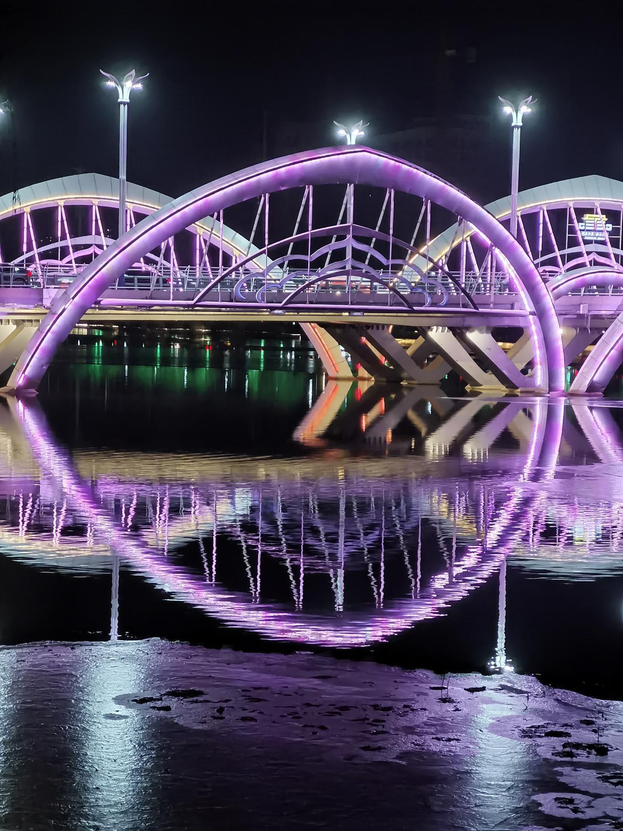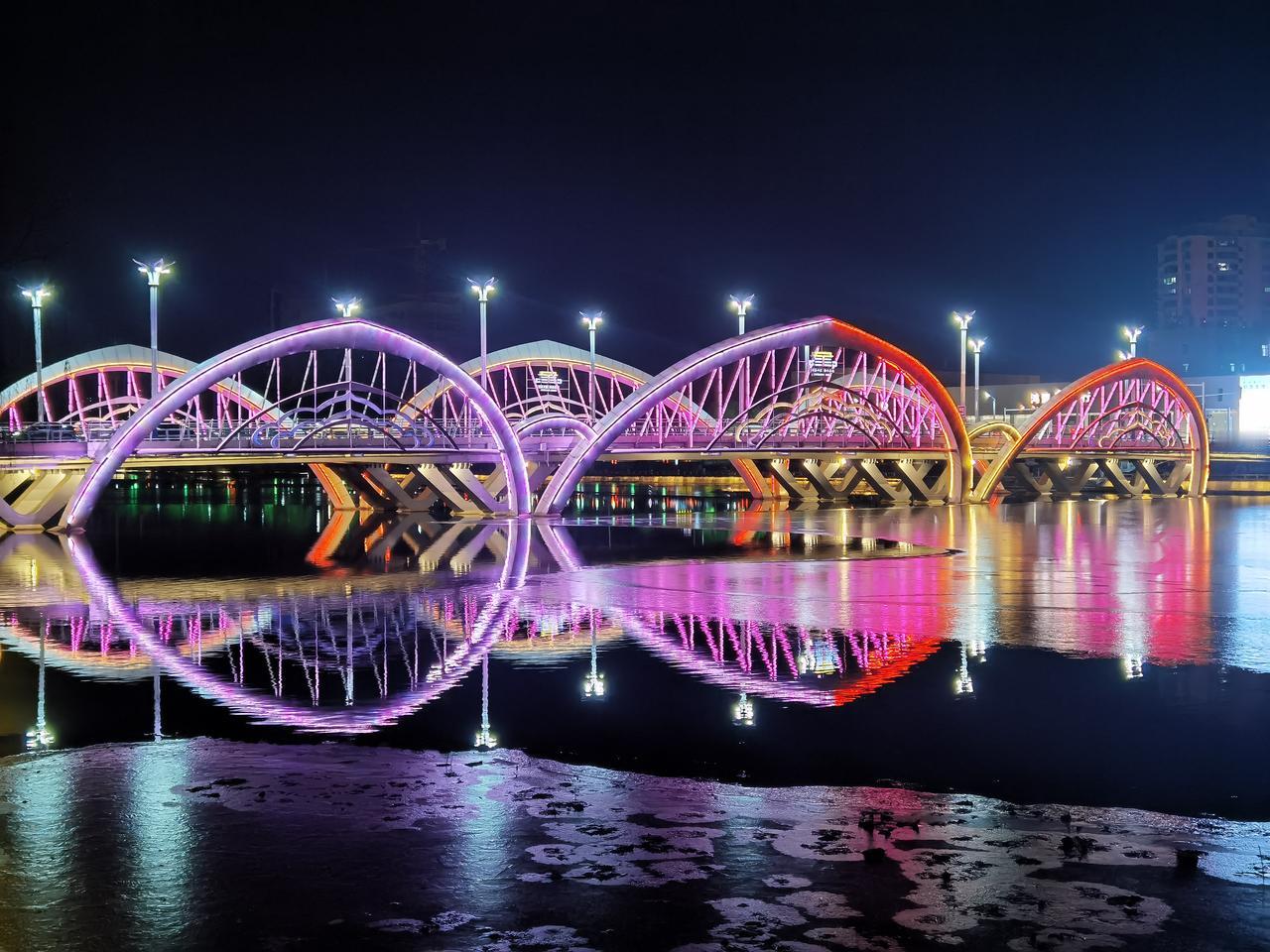 承德市区有一座横跨武烈河的大桥叫九华山大桥,但民间喜欢叫“莲花桥”或“莲花山大桥”。 因为桥栏两侧共有六个大大的莲花花瓣形拱饰,所以称莲花桥更为形象,民间叫法更为通俗易懂。 冬日的塞外山城有些寒意了,但夜晚武烈河上的莲花桥还是很美的,夜晚走走看看是不错的。