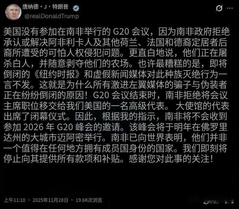 特朗普:美国没有参加在南非举行的G20会议,因为南非政府拒绝承认或解决阿非利卡人及其他荷兰、法国和德裔定居者后裔所遭受的可怕人权侵犯问题。更直白地说,他们正在屠杀白人,并随意剥夺他们的农场。也许最糟糕的是,即将倒闭的《纽约时报》和虚假新闻媒体对此种族灭绝行为一言不发。这就是为什么所有激进左翼媒体的骗子与伪装者正在纷纷倒闭的原因!G20会议结束时,南非拒绝将会议主席职位移交给我们美国的一名高级代表。大使馆的代表出席了闭幕仪式。因此,根据我的指示,南非将不会收到参加2026年G20峰会的邀请。该峰会将于明年在佛罗里达州的大城市迈阿密举行。南非已向世界表明,他们并非一个值得在任何地方拥有成员国身份的国家。我们即刻将停止向其提供所有款项和补贴。感谢您对此事的关注!