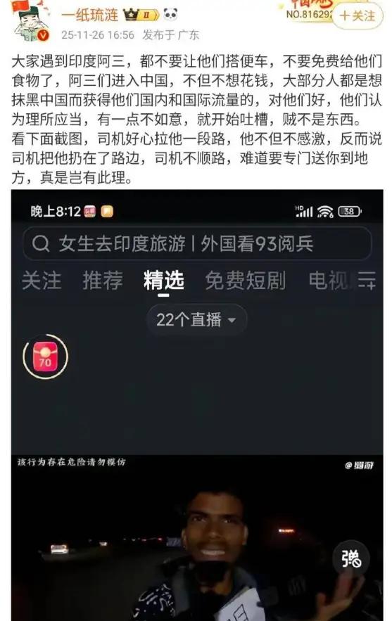 前两天还在说中国厕所没有印度干净,商场也落后于印度。现在在又开始在中文互联网哭诉自己签证马上到期,他不想离开中国博取同情了。而评论区很多国人还好言安慰他,对于这种人就应该禁入。 到期了让他快点走,出海关的时候屁股上踹一脚,让他端了念想。 三代人建设风雨兼程,披星戴月的,不是给你老外享受的,来家必须爱护环境。 为什么要让阿三来我国?,利害眀摆在那里!百思不得其解!那些中印边阶的.守卫的战士实在辛苦! 对这些人,到期就让他走人。特别是厚颜无耻的,造谣污蔑的,行为不端的……走了就不要让他们再踏入中国一步。 中国是中国人的中国!中国的繁荣富强是中国人民自己流血牺牲建设的!中国人民的奋斗成果就应该中国人民享受。