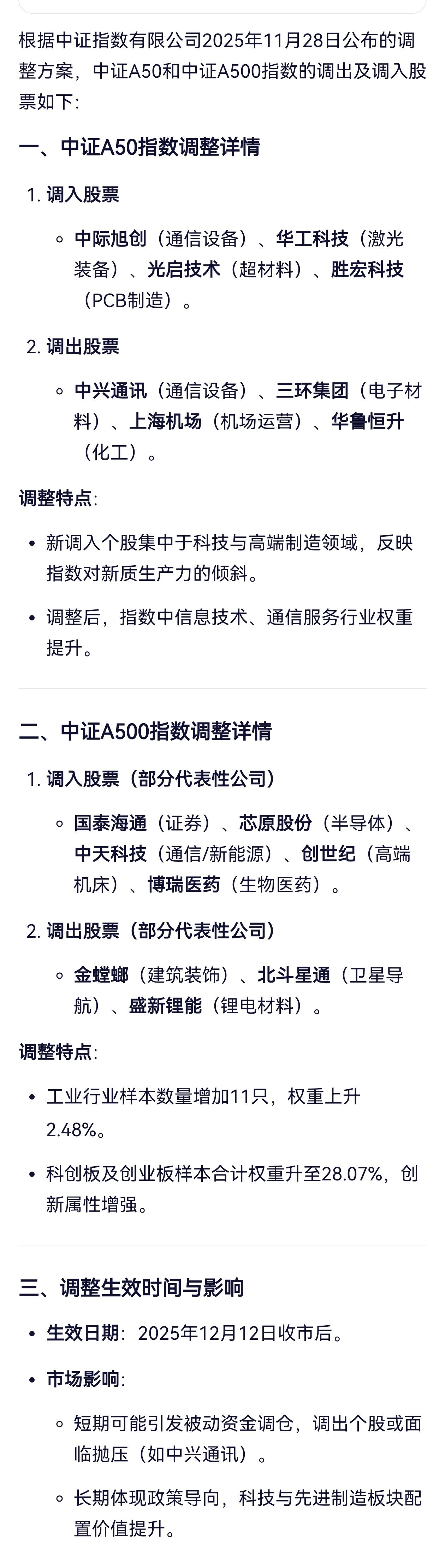 千问回答:中证A50和中证A500调出和调入哪些股票?