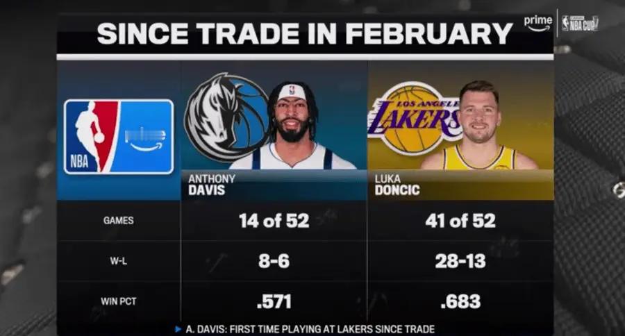 交易发生以来,浓眉为独行侠出战14场胜率57%&东契奇为湖人出战41场胜率68%