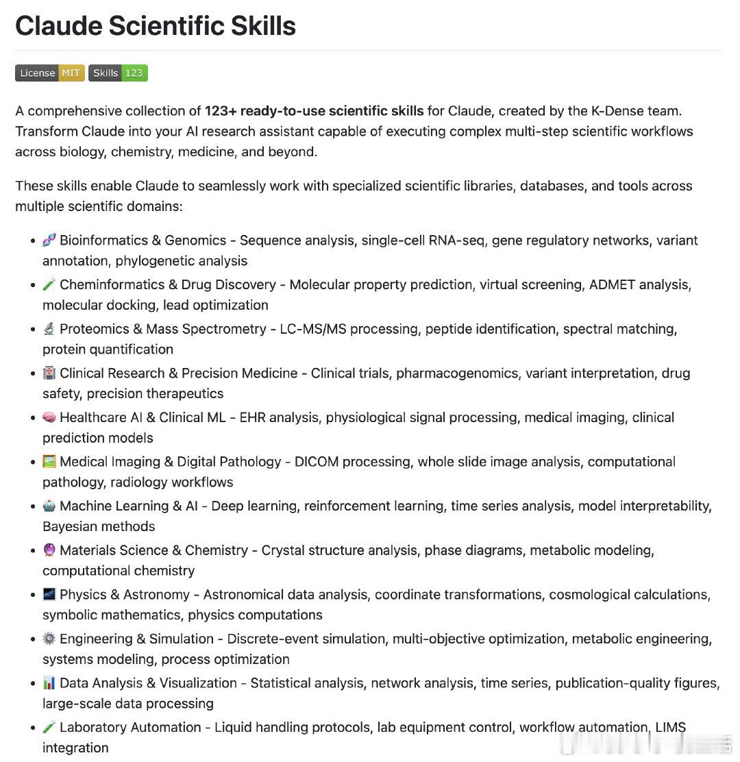 科研工作中,整合多领域工具进行复杂分析常常繁琐耗时。Claude Scientific Skills 提供一套开箱即用的科学技能集合,支持生物信息学、化学信息学、临床研究、材料科学等多学科,助力将 Claude AI 转变成科研助理,完成多步骤科学计算和数据处理。涵盖内容包括:- 直接调用26+科学数据库(PubMed、UniProt、ChEMBL等)- 52+主流科研Python包(RDKit、Scanpy、PyTorch Lightning等)- 15+科研平台集成(Benchling、DNAnexus)- 20+数据分析与文献写作工具支持快速搭建从基因组学分析、药物筛选到临床变异解读、系统生物学网络构建的复杂科研流程。文档完善,提供丰富示例与最佳实践,支持多平台部署,适合科研人员和机构提升研究效率。项目地址:github.com/K-Dense-AI/claude-scientific-skills主要特点:- 一键安装,自动调用相关技能,无需繁琐配置- 跨学科全覆盖,助力多模态多步骤科研任务- 持续更新,社区活跃,支持企业级使用将Claude变成你的“AI科学家”,加速科研创新,解放双手!