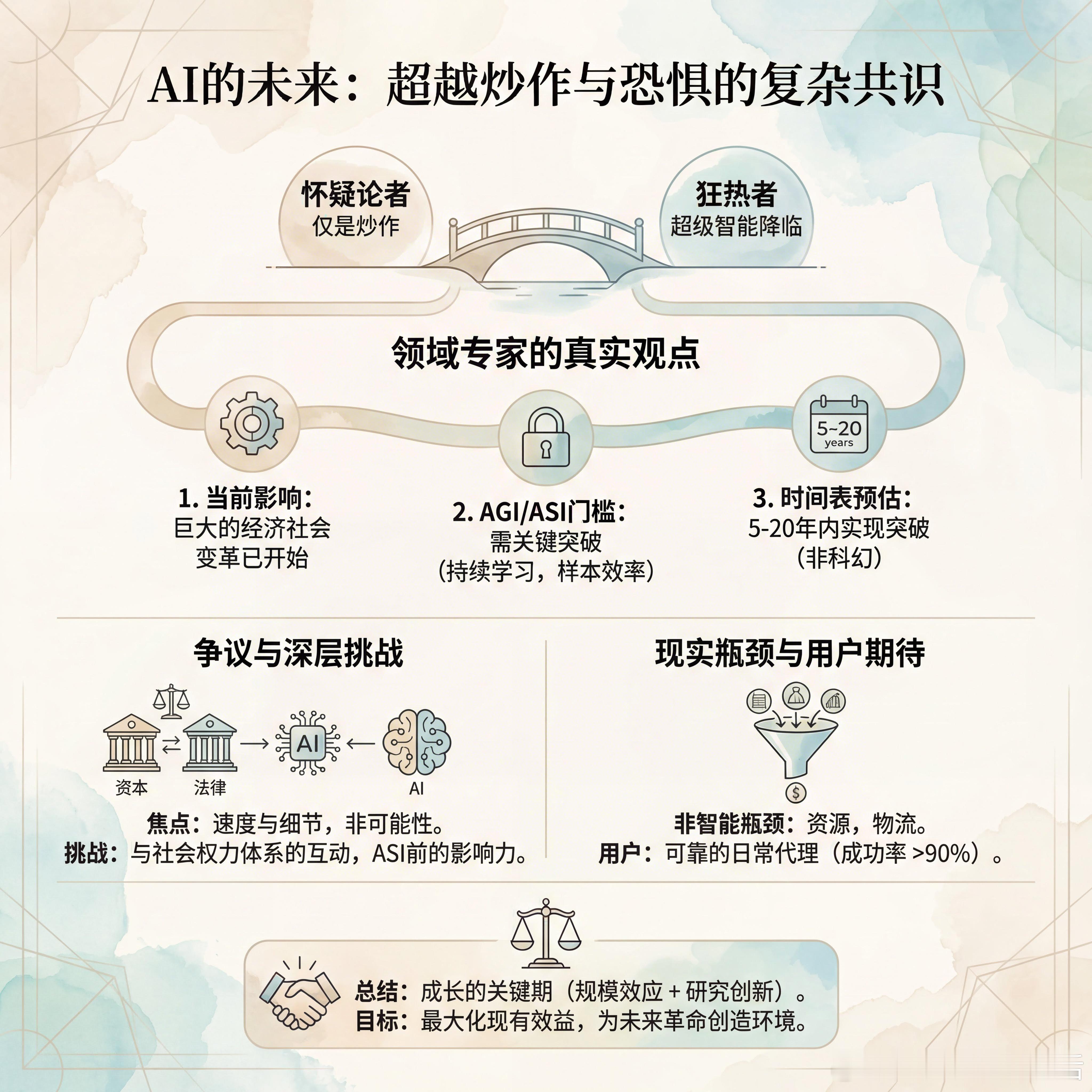 社交媒体上关于AI的讨论常被简化为两种极端:一派怀疑论者认为大语言模型(LLM)不过是炒作;另一派狂热者坚信超级智能即将降临。但深入研究领域专家的真实观点,我们发现远比表面复杂且有惊人共识。首先,目前的AI范式已足够带来巨大的经济和社会影响,甚至无需重大技术突破。换句话说,我们正在见证AI改变世界的开始。其次,实现真正的通用人工智能(AGI)或超级人工智能(ASI),仍需关键研究突破,比如持续学习和样本效率等。这些是当前技术无法轻松跨越的门槛。第三,业界顶尖科学家们普遍预计,这些突破将在未来20年内实现,甚至有观点认为5到10年内即可达成。没有人认为ASI是科幻,或是遥遥无期的百年梦。争议的焦点在于突破具体内容及速度,而非“是否可能”。更深层的思考是:AI的真正挑战不只是技术本身,而是它与现有社会结构、权力体系的互动。未来的关键问题不是“超级智能是否存在”,而是我们在等待它来临前,愿意赋予现有AI系统多大影响力。因为即使在达到ASI之前,AI也足以重塑资本分配、国防、科学和法律等核心领域。此外,智能提升带来的经济产出加速,终将遇到非智能因素的瓶颈,比如实验资源、物流、原材料等。超越这些限制,可能比单纯智能跃升更难察觉。现实中,普通用户期盼的是可靠的AI代理能高效完成日常任务,而非挑战数学竞赛或基准测试。真正的变革,还需AI在实际应用中从40-50%的成功率跃升至90%以上。总结来看,AI正处于“成长的关键期”,既有可预见的规模效应,也迫切需要突破性的研究创新。我们应该关注的是如何最大化现有技术的社会经济效益,同时为未来的革命性突破创造合适环境。这场关于AI未来的讨论,远比“乐观vs悲观”更为丰富。它关乎我们如何理解技术进步的路径,如何应对随之而来的社会变革,以及如何在这场变革中找到自己的位置。原文:x.com/polynoamial/status/1994439121243169176