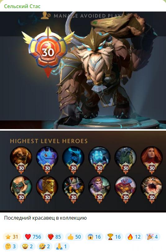 最近马琳在个人电报频道向粉丝分享自己的牛头刚刚达到了PLUS满级宗师级别,算上ES他已经拥有了12个宗师等级英雄,分别是:牛头、Puck、电棍、蓝猫、小小、火女、哈斯卡、蝙蝠、伐木机、大圣、滚滚和獸,数量之多恐怕会让很多职业选手汗颜